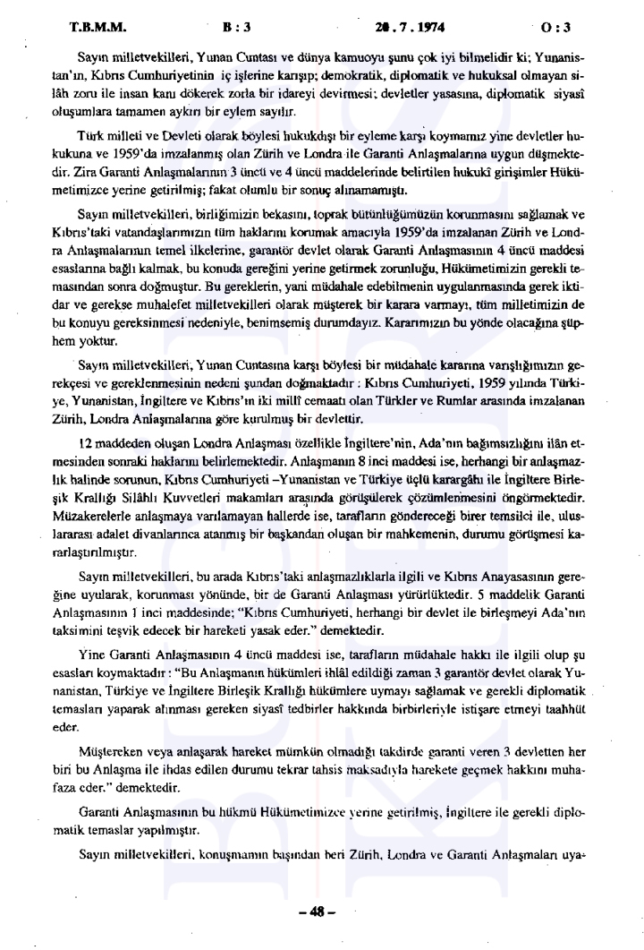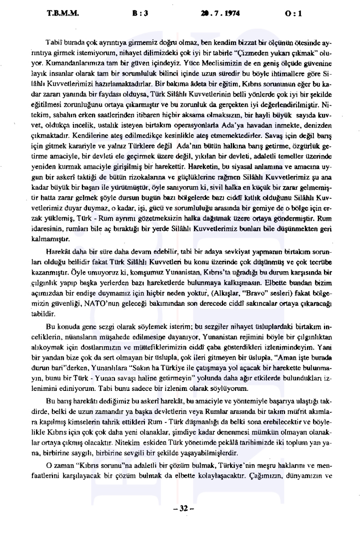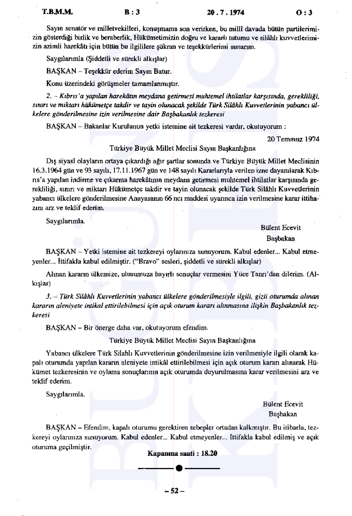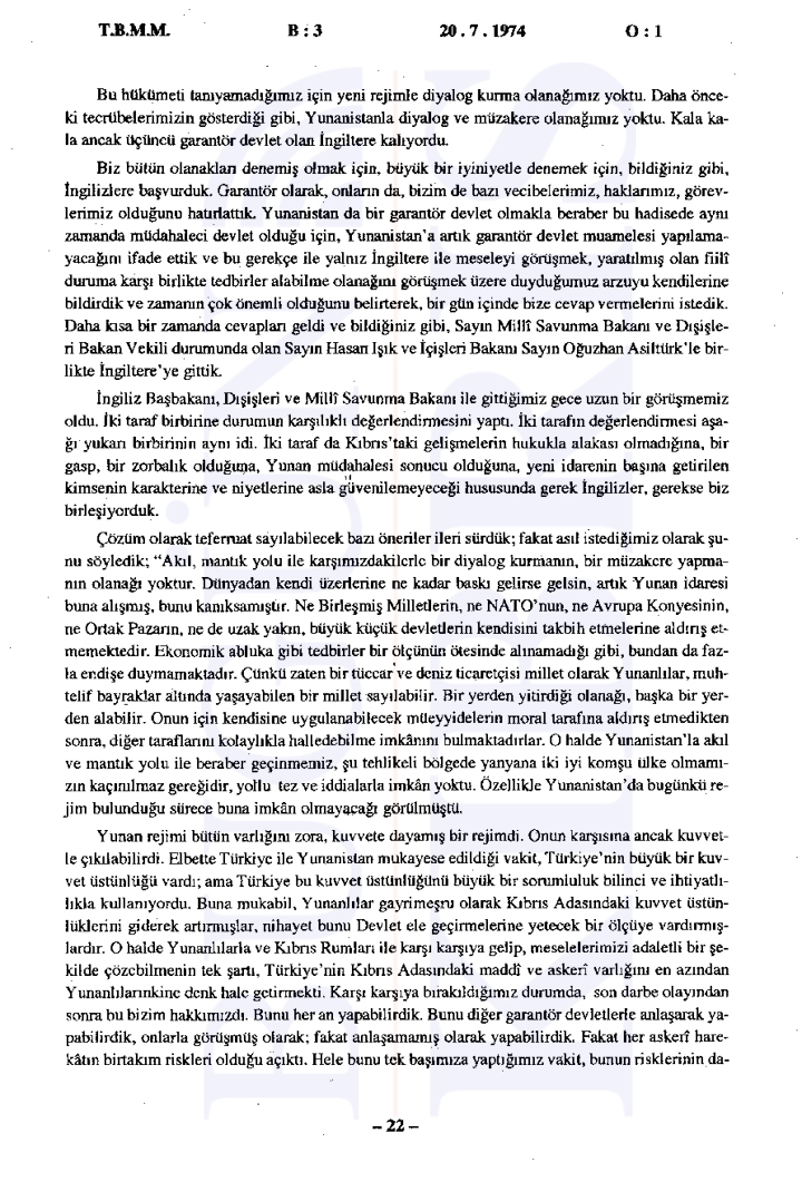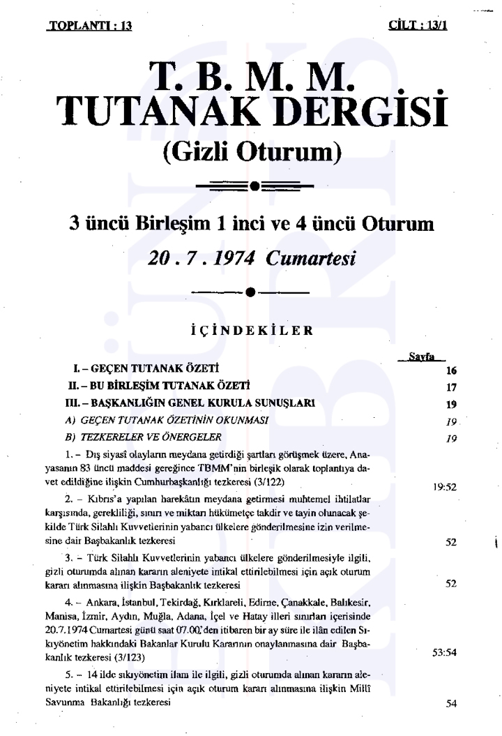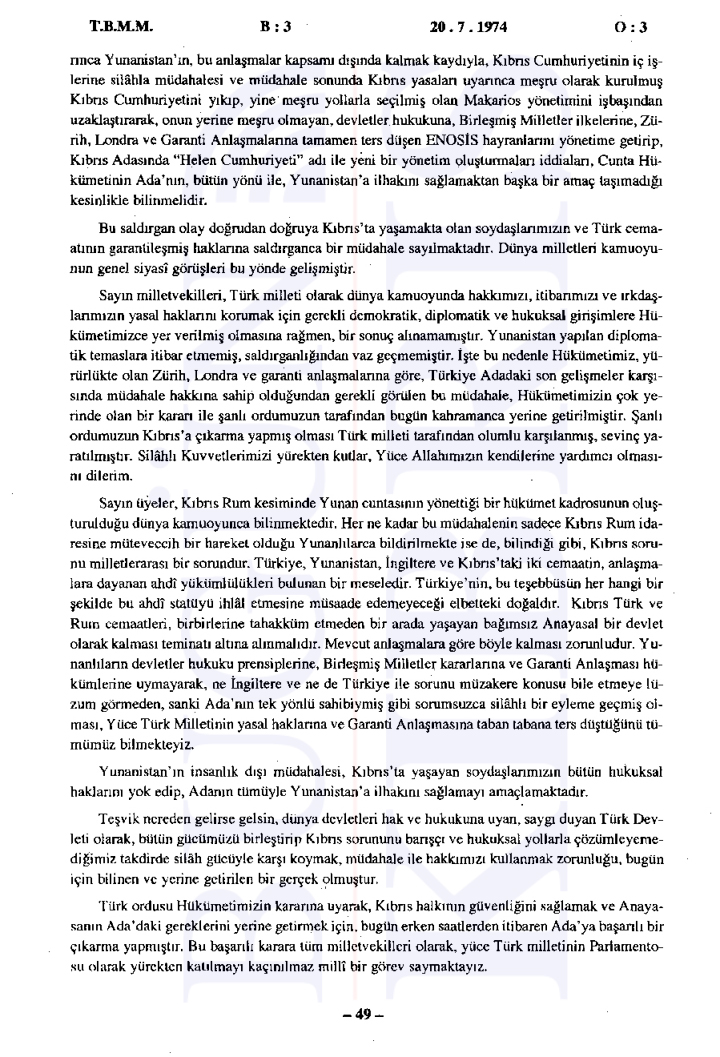 Türkiye Büyük Millet Meclisi’nde 20 Temmuz 1974 tarihinde gerçekleşen tarihi gizli oturumda, sabaha karşı başlatılan Kıbrıs Harekatı’nın gerekçeleri ve uluslararası ilişkiler değerlendirildi. Bugün Kıbrıs’ın elde ettiği tutanaklara göre Başbakan Bülent Ecevit’in liderliğinde gerçekleştirilen oturumda, Türkiye’nin müdahalesinin ana nedeni olarak Kıbrıs’taki Türk toplumunun can ve mal güvenliğinin sağlanması, Kıbrıs Türklerinin haklarının korunması ve adaletli bir çözüm sağlanması gösterildi.