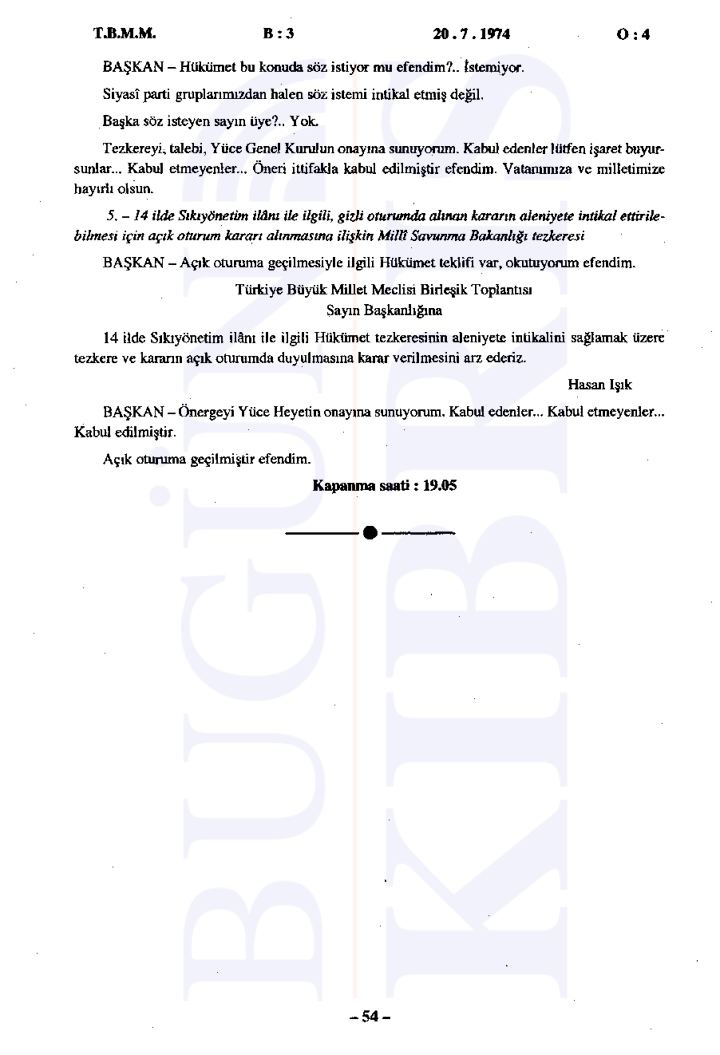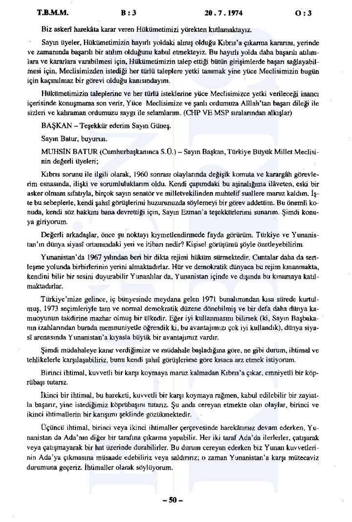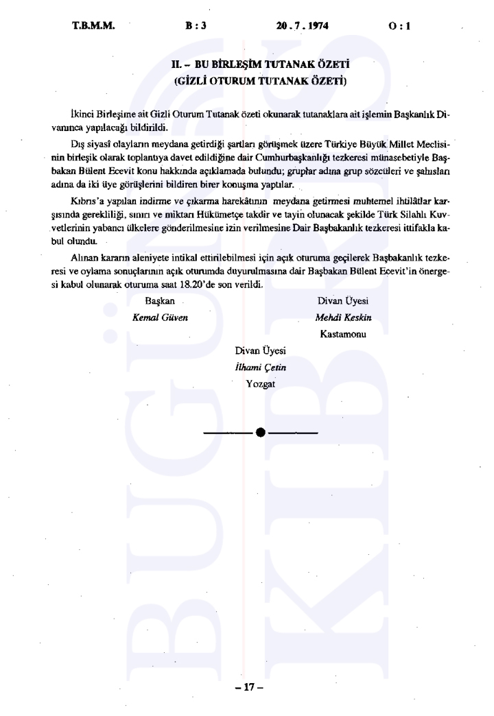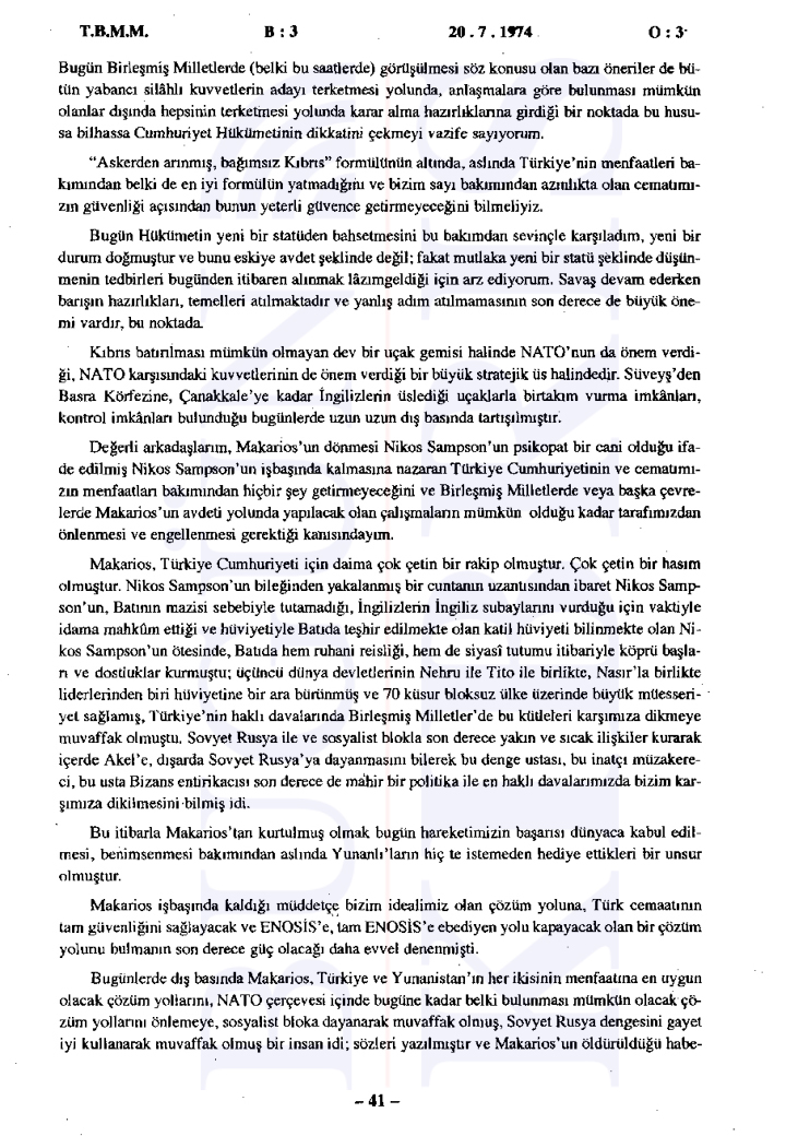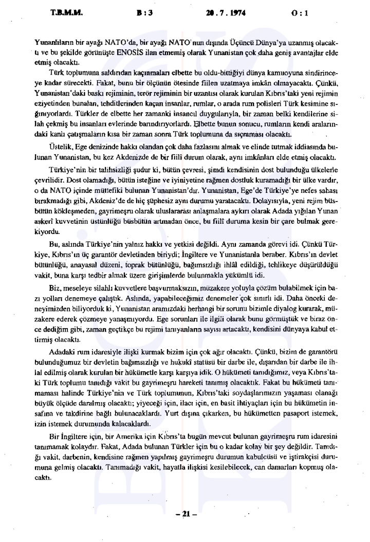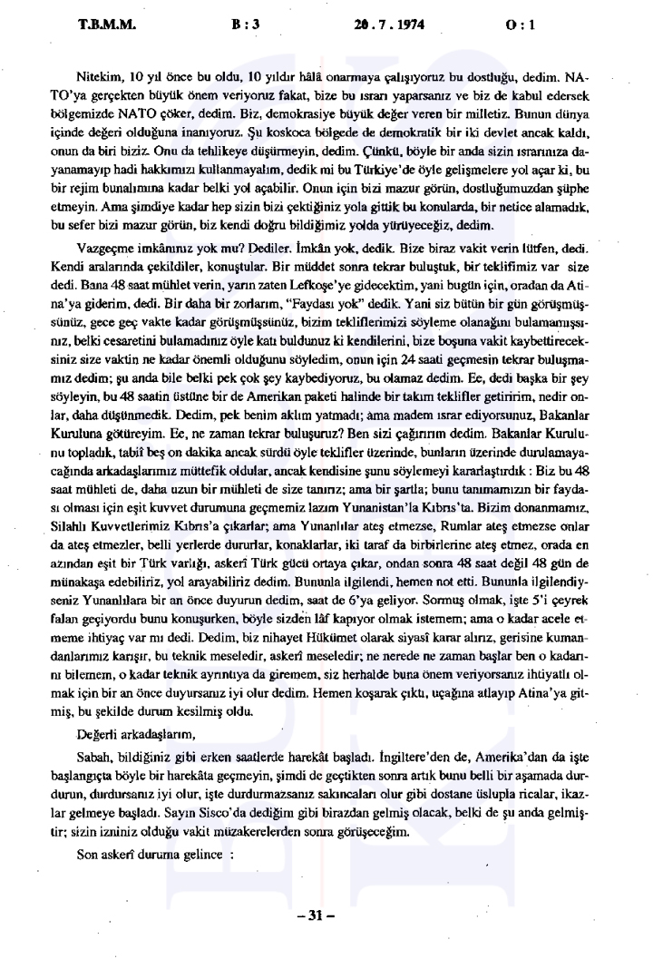 Türkiye Büyük Millet Meclisi’nde 20 Temmuz 1974 tarihinde gerçekleşen tarihi gizli oturumda, sabaha karşı başlatılan Kıbrıs Harekatı’nın gerekçeleri ve uluslararası ilişkiler değerlendirildi. Bugün Kıbrıs’ın elde ettiği tutanaklara göre Başbakan Bülent Ecevit’in liderliğinde gerçekleştirilen oturumda, Türkiye’nin müdahalesinin ana nedeni olarak Kıbrıs’taki Türk toplumunun can ve mal güvenliğinin sağlanması, Kıbrıs Türklerinin haklarının korunması ve adaletli bir çözüm sağlanması gösterildi.