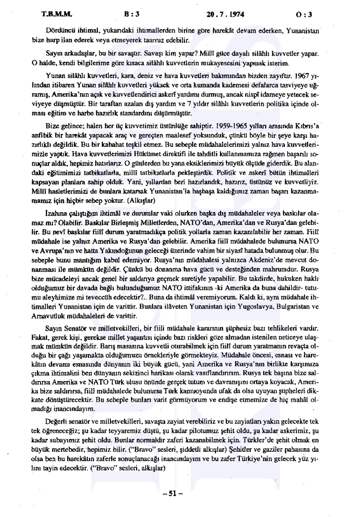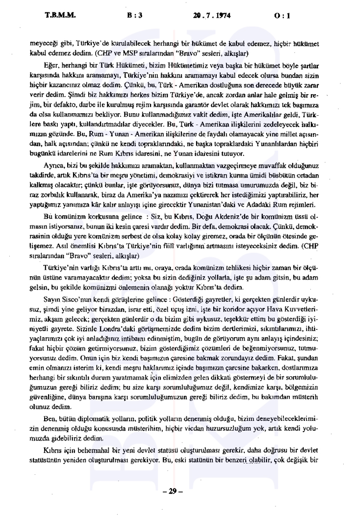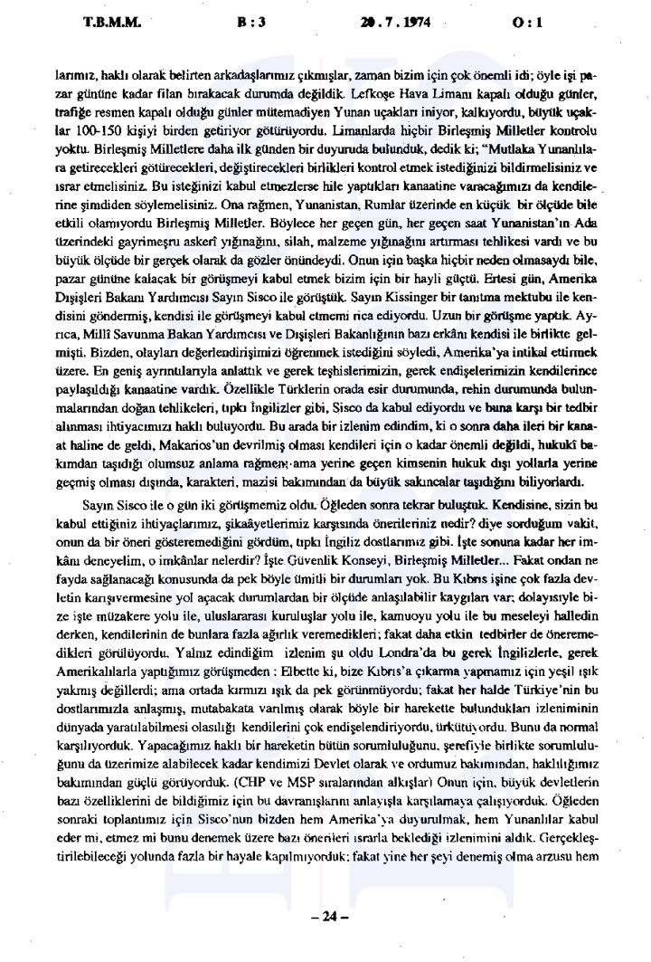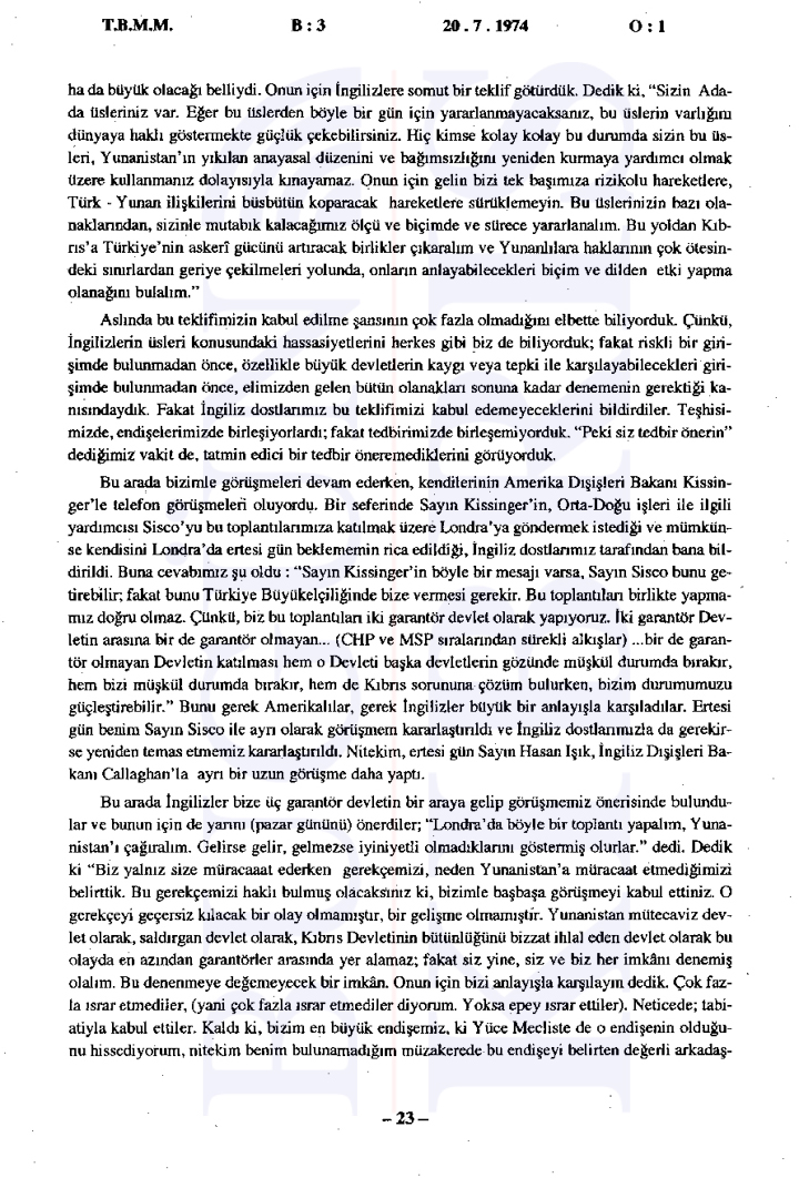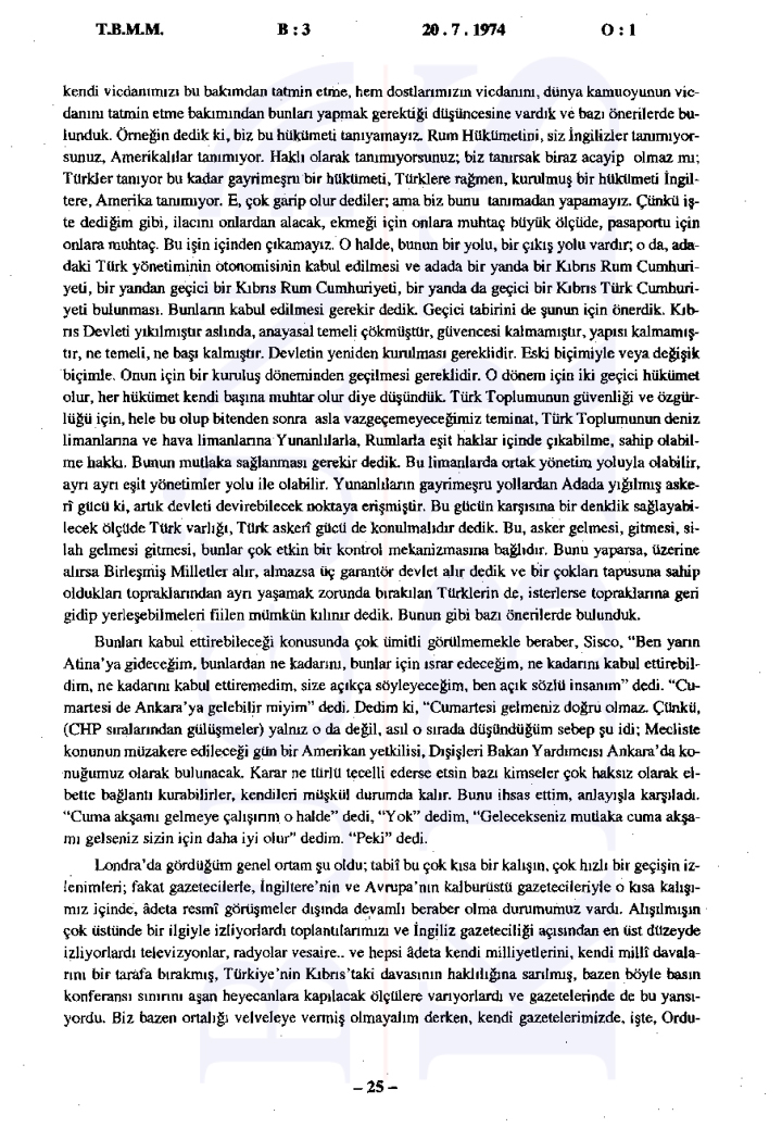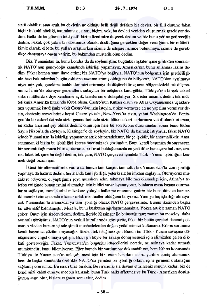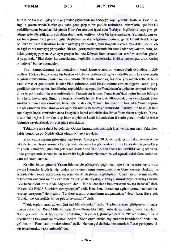 Yunanistan’ın Kıbrıs üzerindeki etkisinin arttığı ve Türkiye’nin Kıbrıs’taki varlığını güçlendirmesi gerektiği vurgulandı. Ayrıca tutanaklara göre İngilizler ve Amerikalılar ile yapılan görüşmelerde Türkiye’nin bu müdahalesi meşru bulundu ancak diğer devletlerin resmi olarak onay vermedikleri görüldü.