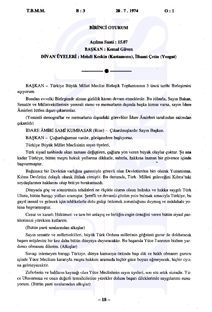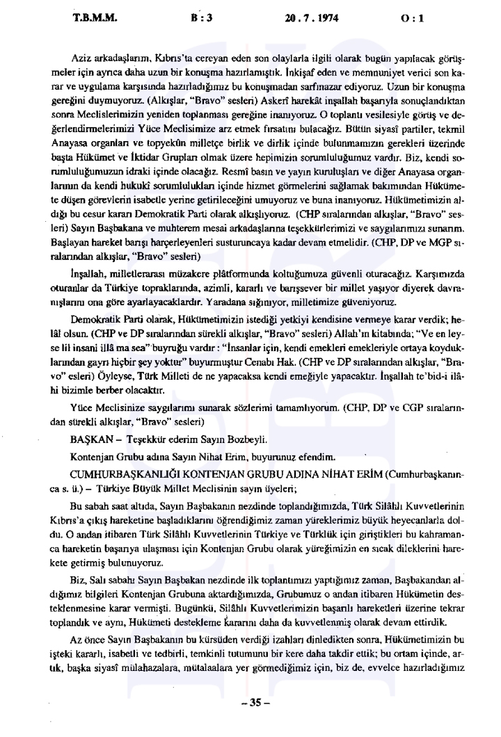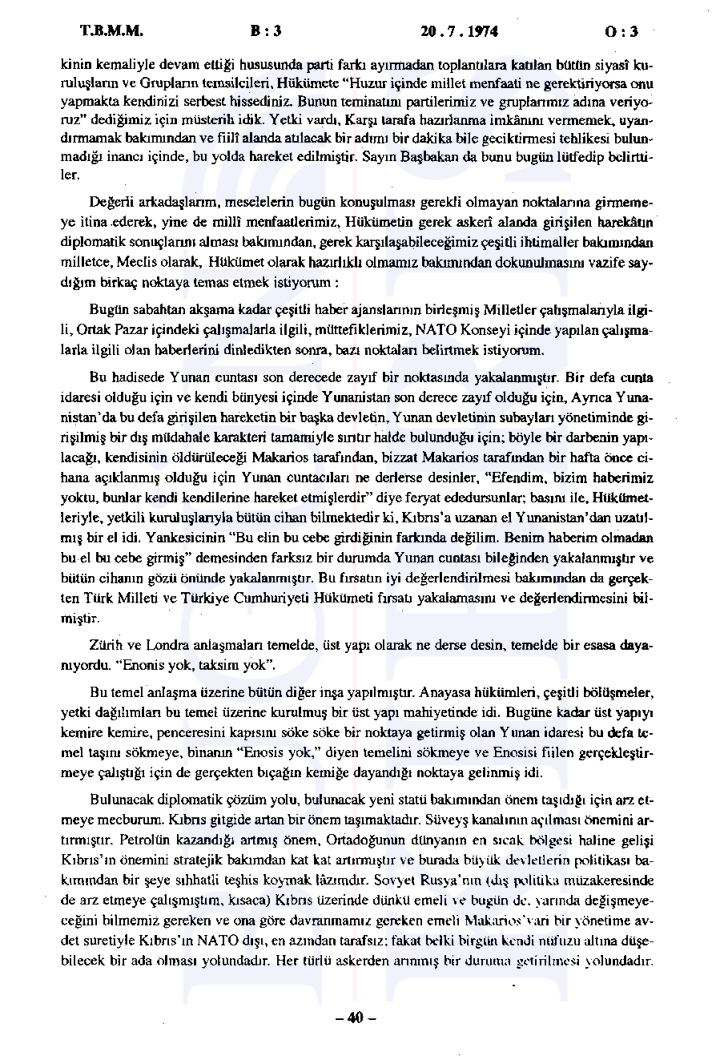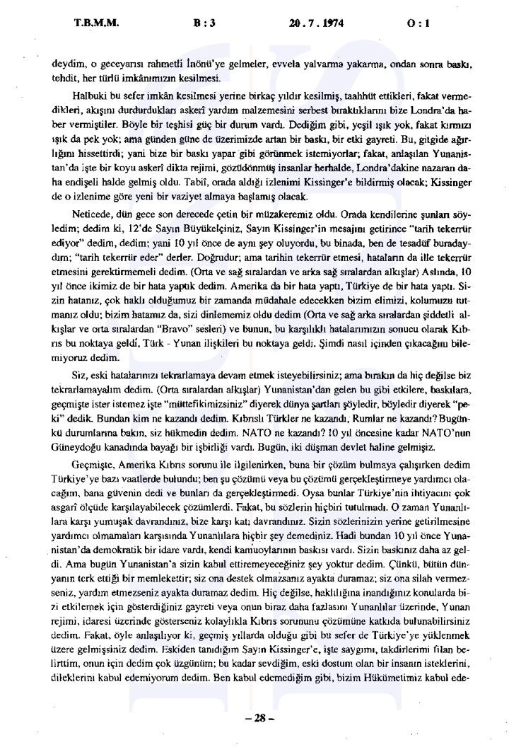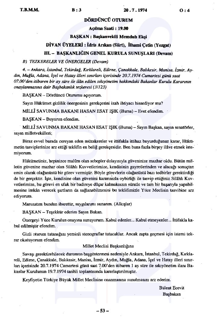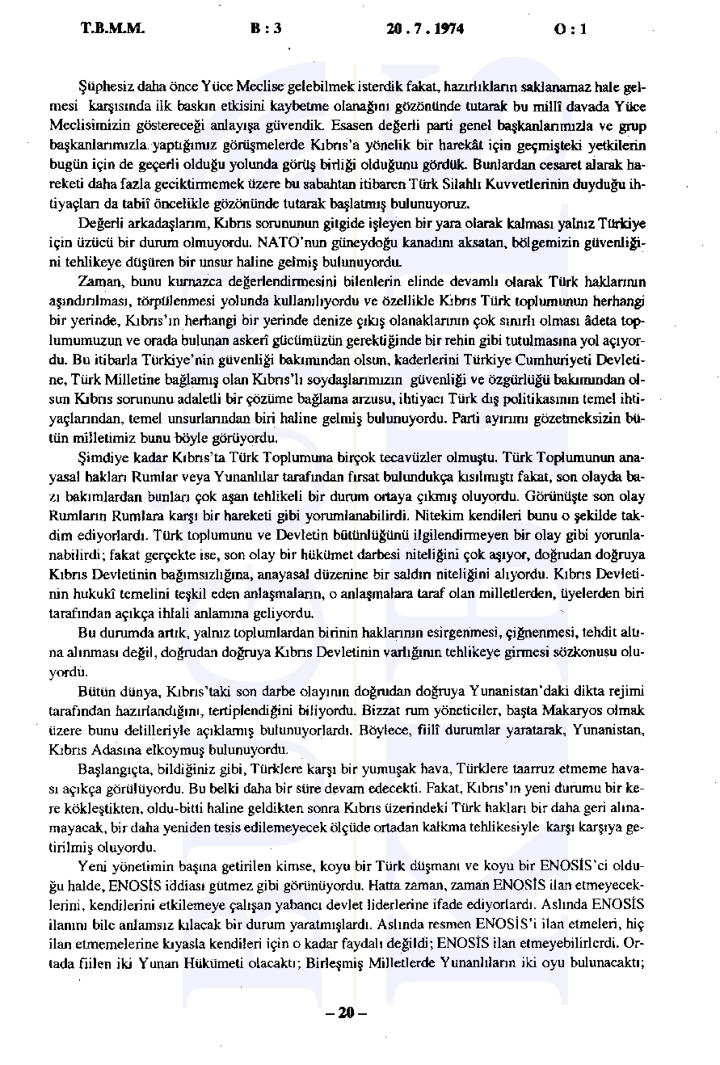20 Temmuz 1974 Cumartesi günü gerçekleşen ilk oturumda, Başbakan Bülent Ecevit Kıbrıs harekatını meşru gerekçelerle savunarak Türk Silahlı Kuvvetlerinin Kıbrıs’a barış, sükûn ve özgürlük getirme amacını vurguladı.