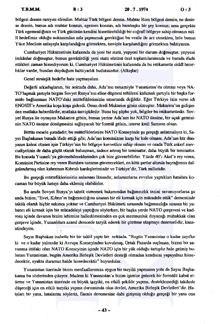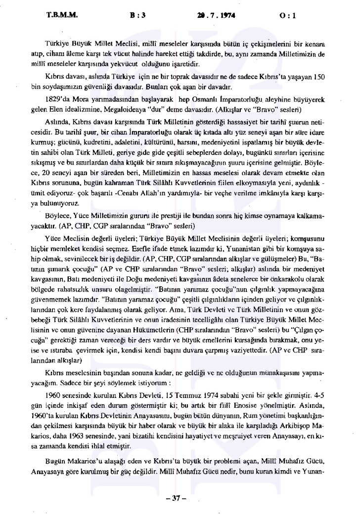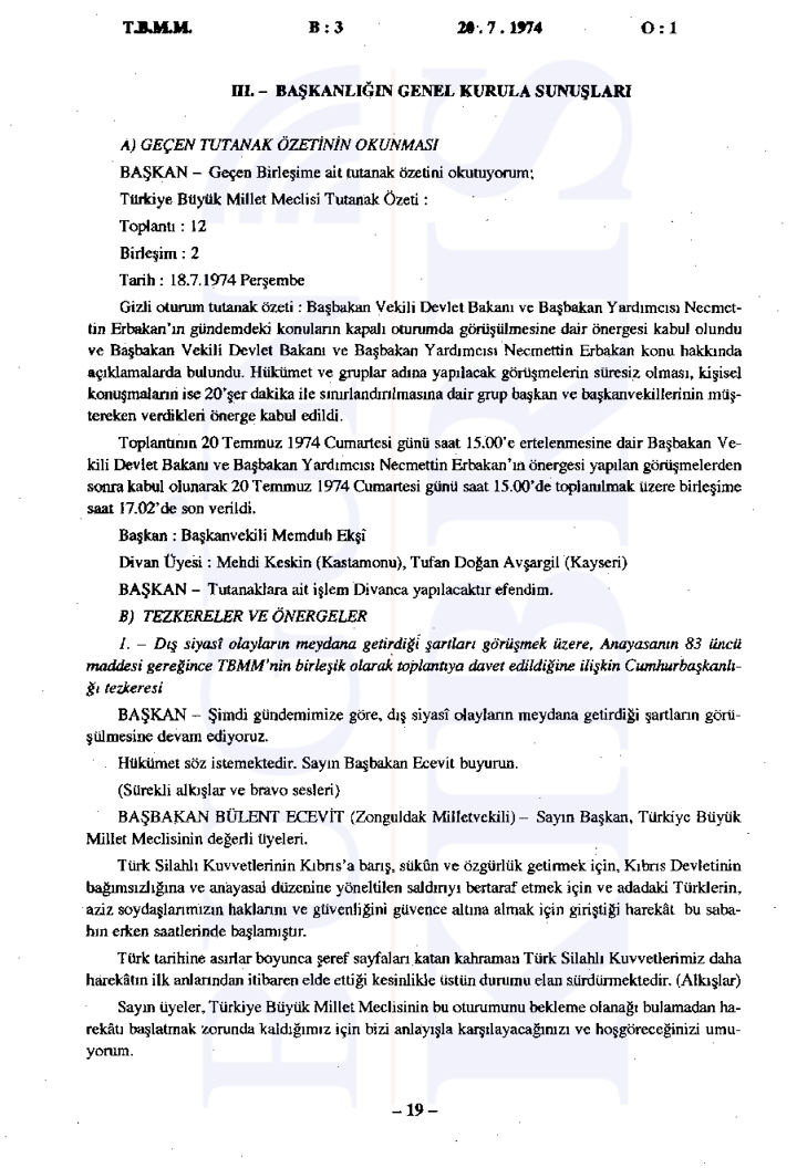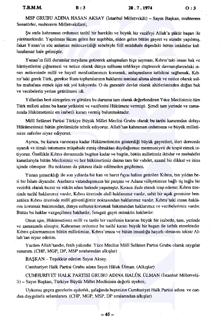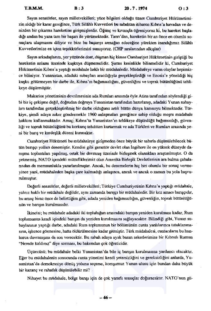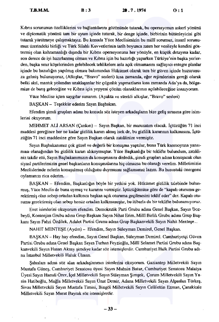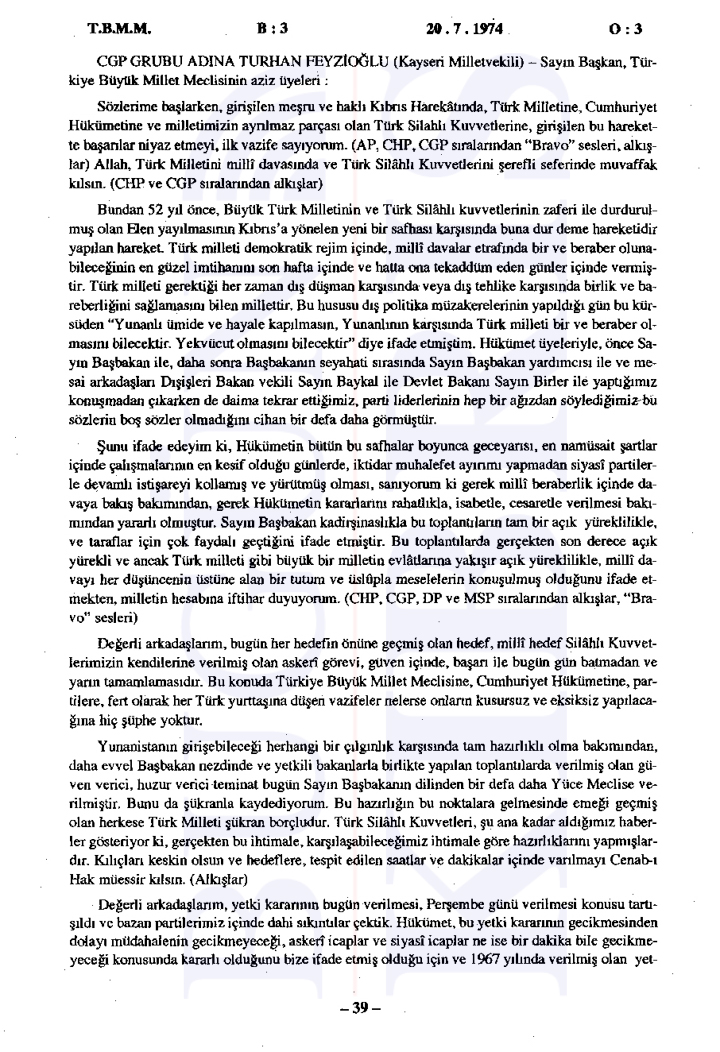 20 Temmuz 1974 Cumartesi günü gerçekleşen ilk oturumda, Başbakan Bülent Ecevit Kıbrıs harekatını meşru gerekçelerle savunarak Türk Silahlı Kuvvetlerinin Kıbrıs’a barış, sükûn ve özgürlük getirme amacını vurguladı.
