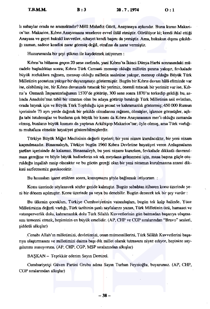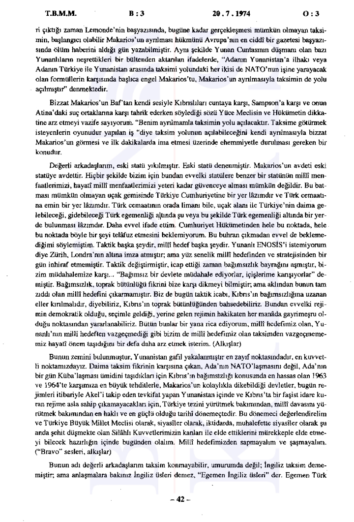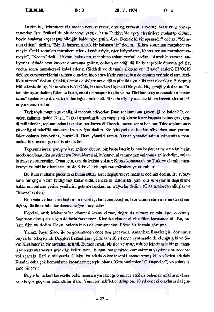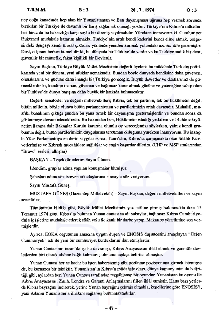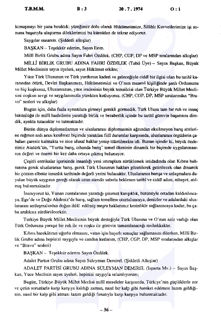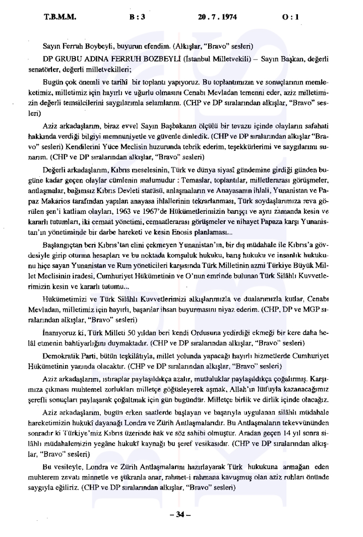 20 Temmuz 1974 Cumartesi günü gerçekleşen ilk oturumda, Başbakan Bülent Ecevit Kıbrıs harekatını meşru gerekçelerle savunarak Türk Silahlı Kuvvetlerinin Kıbrıs’a barış, sükûn ve özgürlük getirme amacını vurguladı.