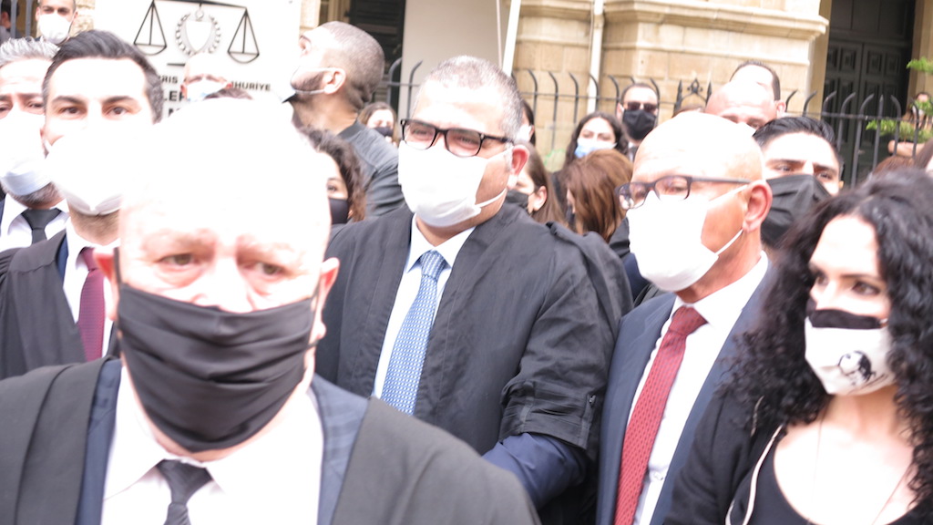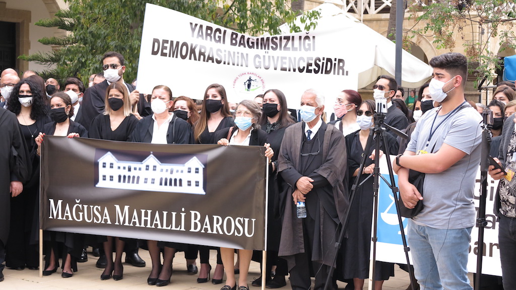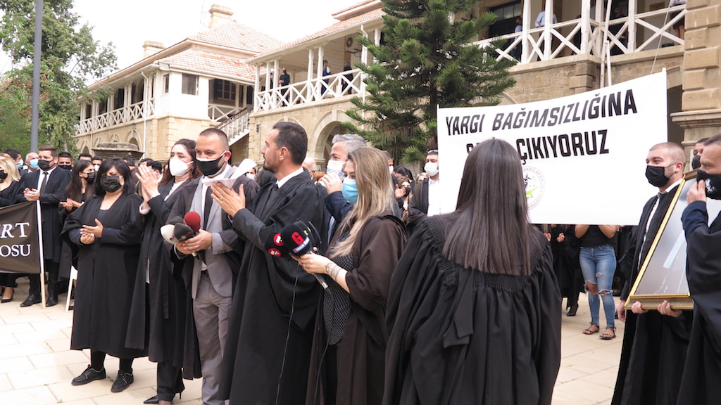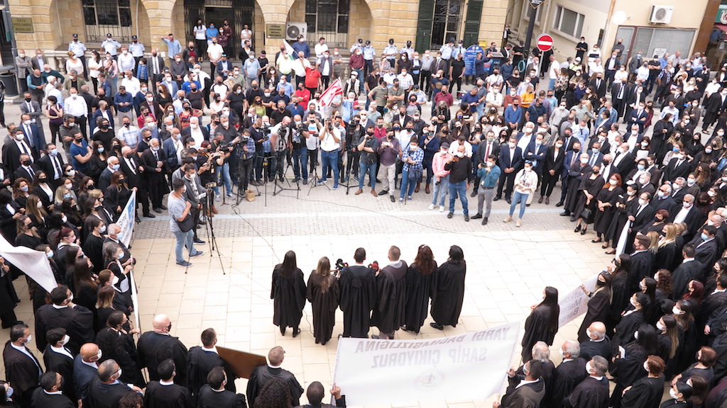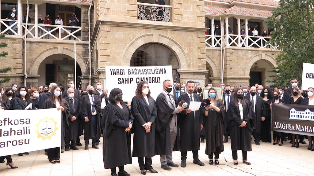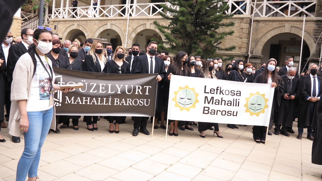 Kıbrıs Türk Barolar Birliği Konseyi, Lefkoşa Mahalli Barosu, Güzelyurt Mahalli Barosu, Girne Mahalli Barosu ve Mağusa Mahalli Barosu, Lefkoşa’da Mahkemeler önünde eylem düzenledi. Eylem için Mahkemeler önüne kortejle gelen avukatlar, ellerinde çerçevelenmiş Atatürk fotoğrafı taşıdı.