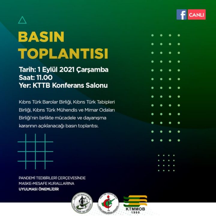 Kıbrıs Türk Barolar Birliği, Kıbrıs Türk Tabipleri Birliği ile Kıbrıs Türk Mühendis ve Mimar Odaları Birliği ortak mücadele ve dayanışma kararını 1 Eylül’de yapacakları basın toplantısında duyuracaklarını açıkladı.