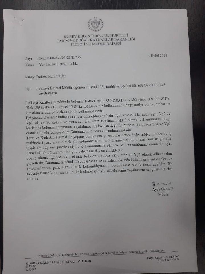 Yine aynı yazıda söz konusu arazinin Organize Sanayi Bölgeleri Yasası kapsamında kiralanabilmesi için Bakanlığımızın hazırlayacağı Bakanlar Kurulu Önergesi ile Ekonomi ve Enerji Bakanlığı Sanayi Dairesi Müdürlüğü kontrol ve yönetimine verilmesi talep edilmiştir. Yapılan talep üzerine Lefkoşa Kızılbaş mevkiinde bulunan Pafta/Harita XXI/30 WII Blok E Parsel 13’ün Jeoloji ve Maden Dairesi’nin kullanımında olup atölye binası, ambar ve iş makinesinin park alanı olduğu 1.10.2021 tarih ve JMD.0.00.633/03-21/E.736 sayı ve yazı ile Sanayi Dairesi Müdürlüğü’ne iletilmiştir.