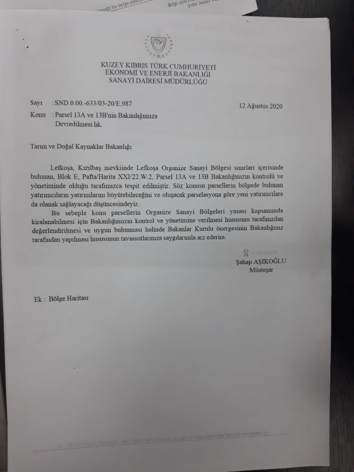 Ekonomi ve Enerji Bakanlığı Sanayi Dairesi’nin Bakanlığımıza muhatap SND.0.00-633/03-20/E.987 sayı ve 12.8.2020 tarihli yazısından da Lefkoşa Kızılbaş mevkiinde Lefkoşa Organize Sanayi Bölgesi sınırları içinde bulunan Blok E Pafta/Harita XXI/22.W.2 Parsel 13A ve 13B Bakanlığımızın kontrol ve yönetiminde olduğu tespiti açıkça belirtilmektedir.