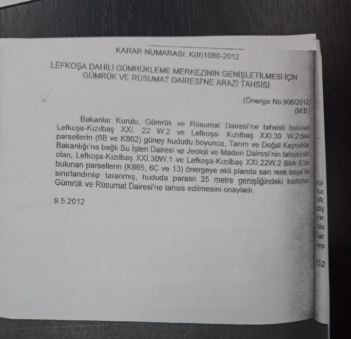 Parselle ilgili K(II)-1080-2012 sayı ve 9/5/2012 tarihli Bakanlar Kurulu Kararı ile Tarım ve Doğal Kaynaklar Bakanlığı’na bağlı Jeoloji ve Maden Dairesi’nin tahsisinde bulunan Lefkoşa Kızılbaş XXI-XXII W2 Blok E’de bulunan Parsel 13’ün kenarından 35 m genişliğindeki bir kısmı komşu parselde faaliyet gösteren Gümrük ve Rüsumat Dairesi’ne tahsis edilmiştir. Bu kararda da açıkça belirtildiği gibi ilgili parsel Bakanlığımıza bağlı Jeoloji ve Maden Dairesi’nin kullanımındadır.