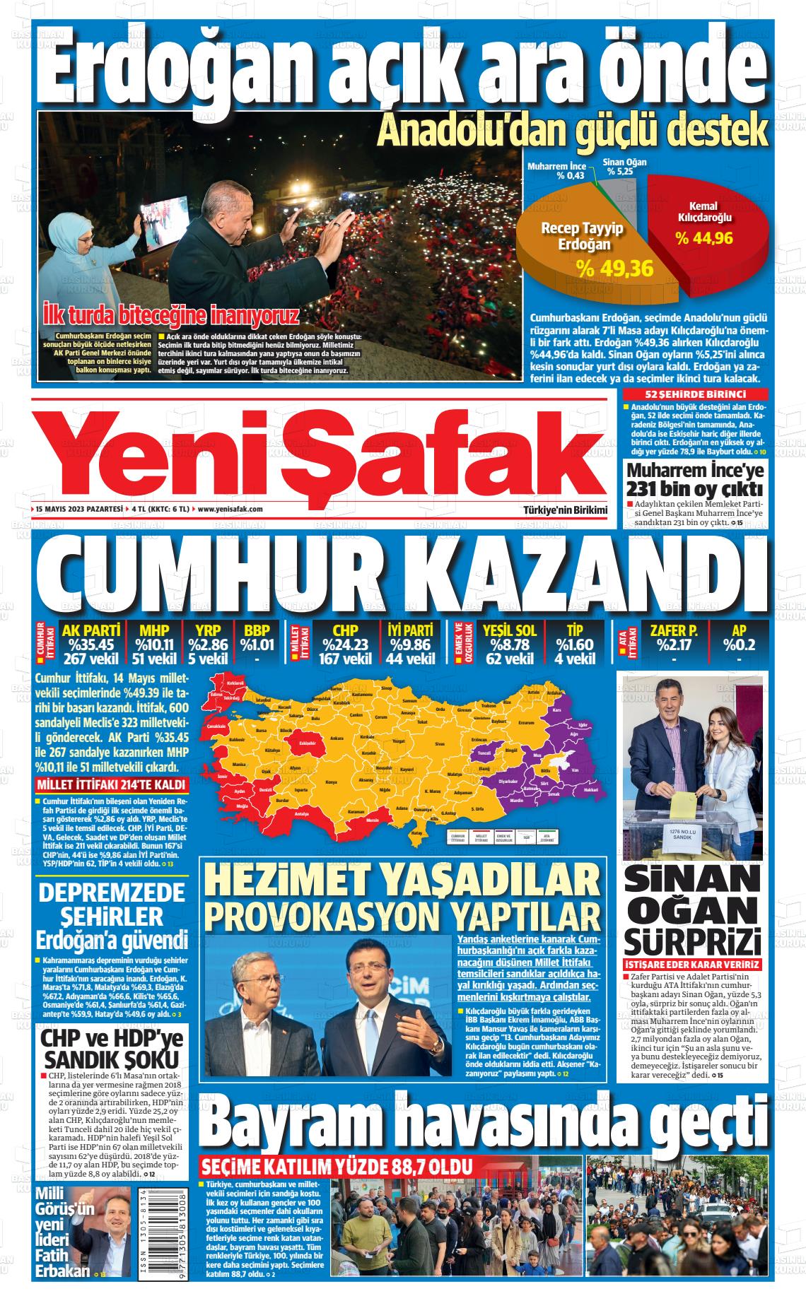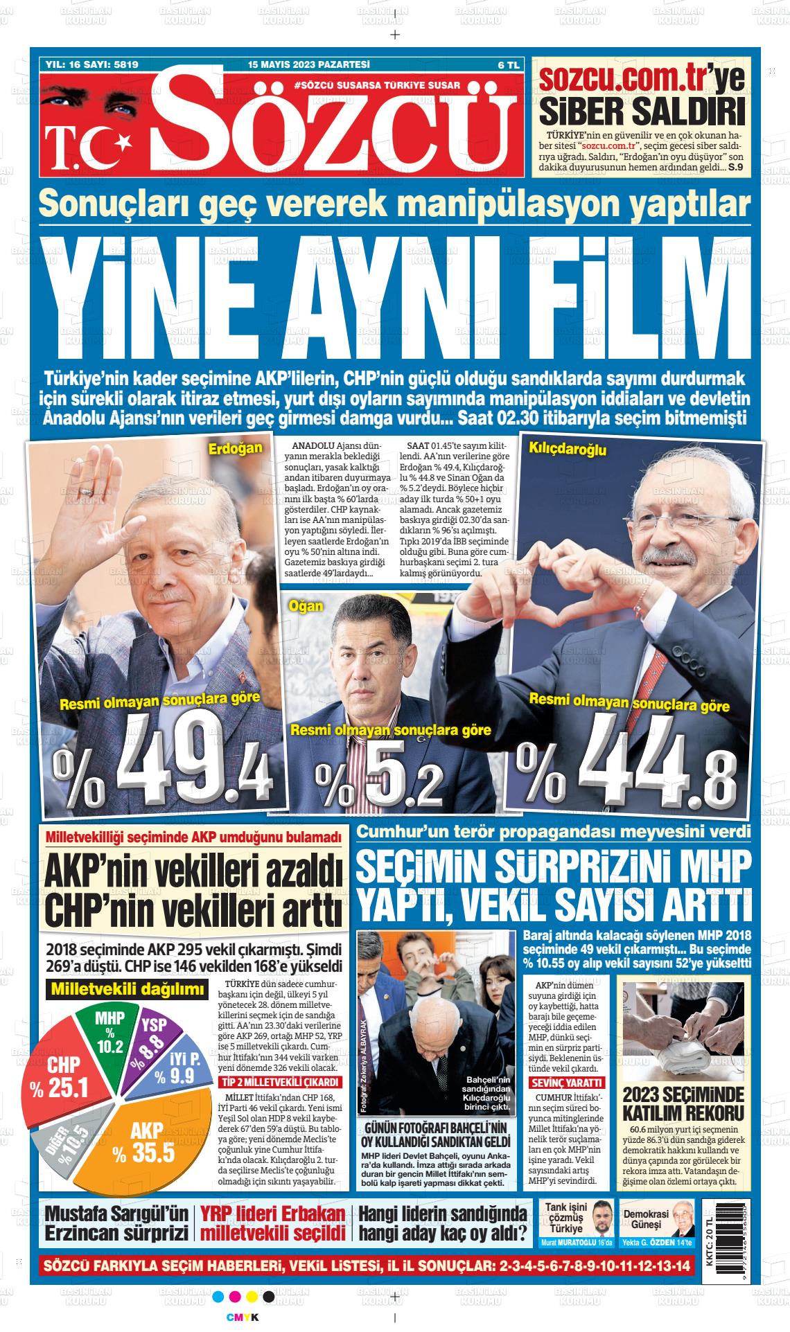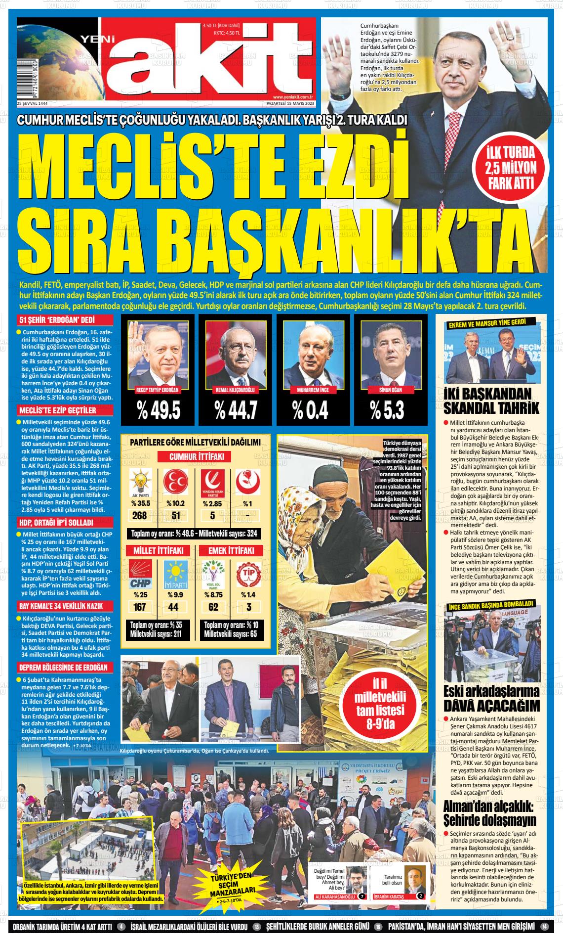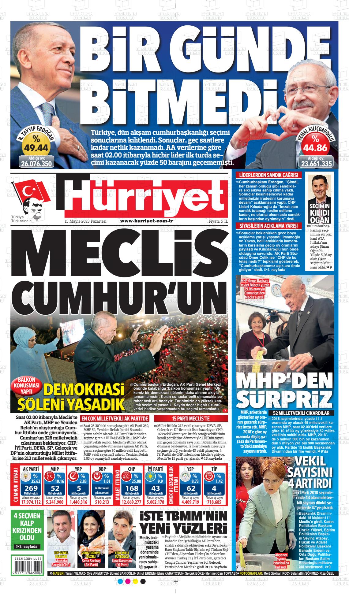 14 Mayıs seçimleri sonrası Cumhuriyet 'Erdoğan kaybetti' manşeti atarken, Hürriyet 'Bir günde bitmedi', BirGün, "Salladık, yıkacağız', Yeni Şafak ise 'Erdoğan açık ara önde' manşetini attı.
