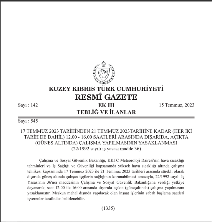 22/1992 sayılı İş Yasası’nın 36. maddesine dayanılarak alınan karara göre, 17 Temmuz 2023 tarihinden 21 Temmuz 2023 tarihine kadar (her iki tarih de dahil) saat 12:00 ile 16:00 arasında dışarıda, açık alanda (güneş altında) çalışma yapılması yasaklandı.