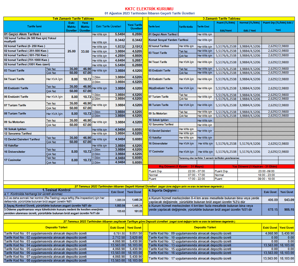 Kıbrıs Türk Elektrik Kurumu (Kıb-Tek), yarından itibaren geçerli olacak yeni elektrik fiyatlarını açıkladı. Buna göre, konut tarifelerinde kilowatt-saat başına 0,25 ila 0,74 TL arasında artış yapıldı.
