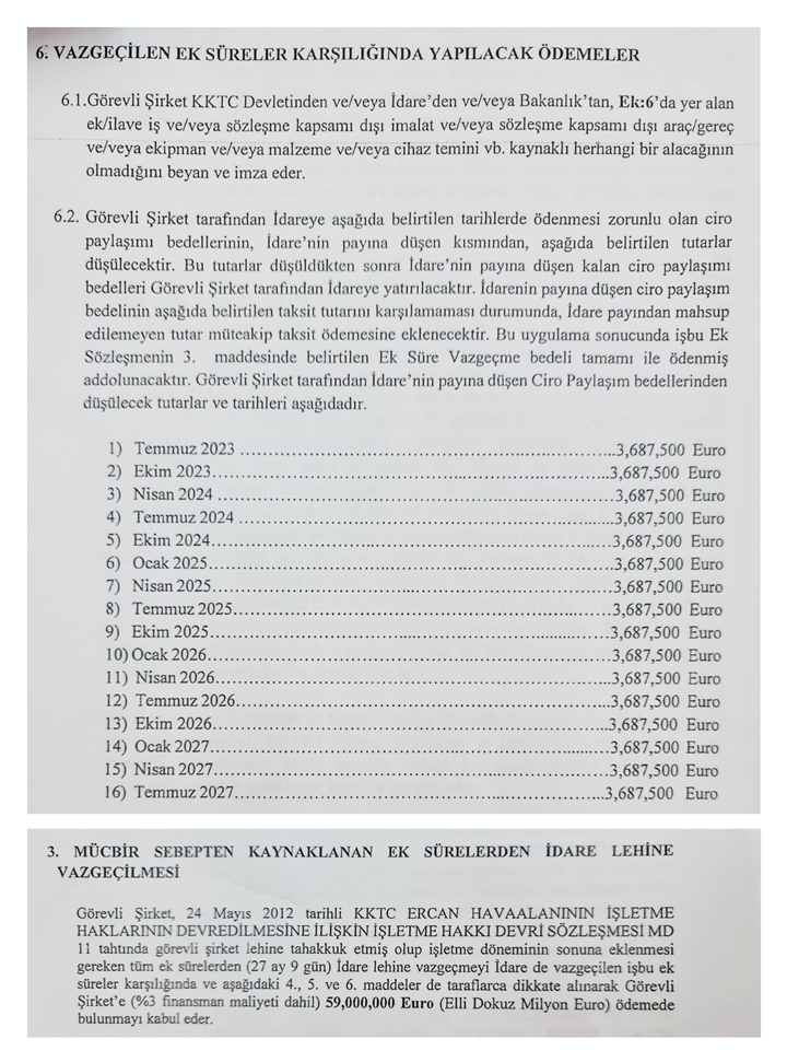 2012 yılında imzalanan Ercan Özelleştirme İhalesi’nin İdari ve Teknik Şartnamesi’nin, hukuken daha sonra imzalanacak olan ek sözleşmelere zemin teşkil etmek zorunda olduğunu belirten Şahiner, “UBP-DP-YDP Hükümeti bu yasal yükümlülüklerini görmezden gelerek 60 milyon Euro’yu T&T şirketinin kasasına koyacaktır” dedi.