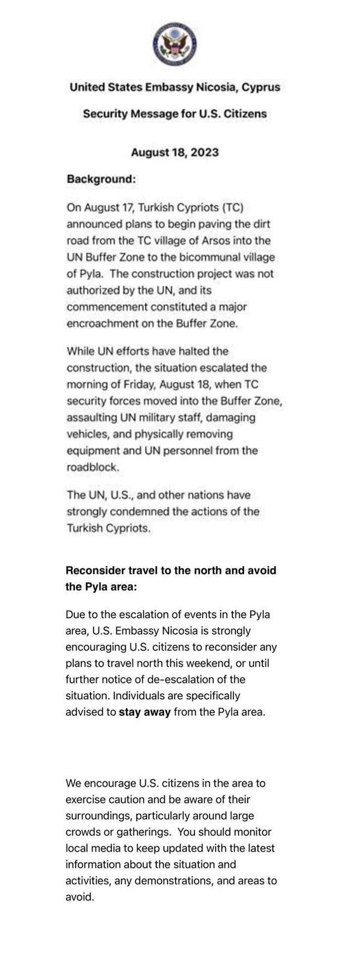 ABD Büyükelçiliği güvenlik uyarısında, “Bölgedeki ABD vatandaşlarını dikkatli olmaya ve özellikle büyük kalabalıklar veya toplantılar etrafında çevrelerine dikkat etmeye teşvik ediyoruz. Durum ve faaliyetler, gösteriler ve kaçınılması gereken alanlar hakkında en son bilgilerden haberdar olmak için yerel medyayı izlemelisiniz” ifadelerini kullandı. Kıbrıs Türk tarafının şiddet eylemlerinin, BM, ABD ve diğer uluslar tarafından kınandığı da uyarıda ayrıca yer aldı.