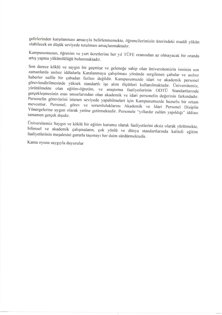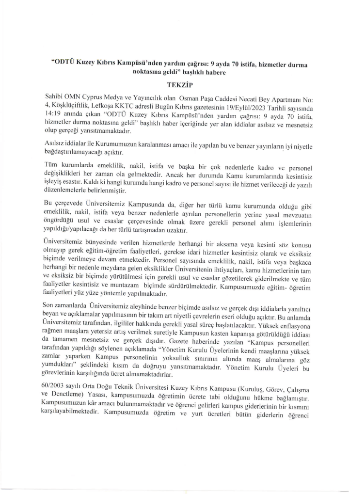 Gazetemizde yayınlanan Orta Doğu Teknik Üniversitesi Kuzey Kıbrıs Kampüsü (ODTÜ KKK) personellerinin açıklamalarının yer aldığı “ODTÜ Kuzey Kıbrıs Kampüsü’nden yardım çağrısı: 9 ayda 70 istifa, hizmetler durma noktasına geldi” başlıklı haberimize okul yönetimi tarafından tekzip gönderildi.