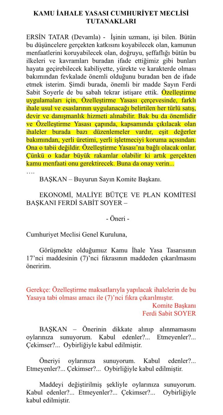 Aşağıdaki tutanaktan da görülebileceği üzere “özelleştirme maksatlarıyla yapılacak ihalelerin de Kamu İhale Yasası’na tabi olması amacıyla” yasada komite toplantısında OYBİRLİĞİ ile değişiklik yapılmıştır!!!”