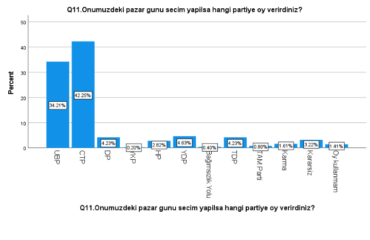 Anket sonuçlarına göre, olası bir seçimde Cumhuriyetçi Türk Partisi (CTP) diğer partilerin önünde ve önemli bir farkla önde çıkıyor.
