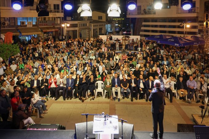 Yağışlı havaya rağmen meydanı dolduran Güzelyurt halkına teşekkür ederek sözlerine başlayan Cumhurbaşkanı adayı Tufan Erhürman, “Güzelyurt, bu akşam adın gibi güzelsin… Adından bile daha güzelsin” dedi. “Uzun bir yolu yürüyerek bugüne geldik. Sayılı gün kaldı… Günleri sayıyoruz. Çok emek verdiniz, çok sabır gösterdiniz” diyen Erhürman, “Gelin yol arkadaşı olalım, bu yolu birlikte yürüyelim” davetini kabul eden ve destek veren herkese yürekten teşekkürlerini sundu. Cumhurbaşkanlığı makamının tarafsız bir makam olduğunu hatırlatan Erhürman, sadece siyasi düzeyde değil, örgütlerden, sendikalardan da gelen destekleri anımsattı. Tufan Erhürman, “20 Ekim’de tarafsız ve halkını kucaklayan bir cumhurbaşkanlığı olacak. Ama biz bugün halkımızla kucaklaşarak, sağcı-solcu demeden iki şey için bir araya geldik: Bu topraklara ve çocuklarımıza duyduğumuz sevgidir bizi bir araya getiren. Bu toprakların, bu çocukların gailesini çekmeyenler bunu anlamazlar. Onlar varsın anlamasınlar; biz yüreklerimizde bunu hissediyoruz. Bu yolu birlikte yürümeye devam ediyoruz” dedi.