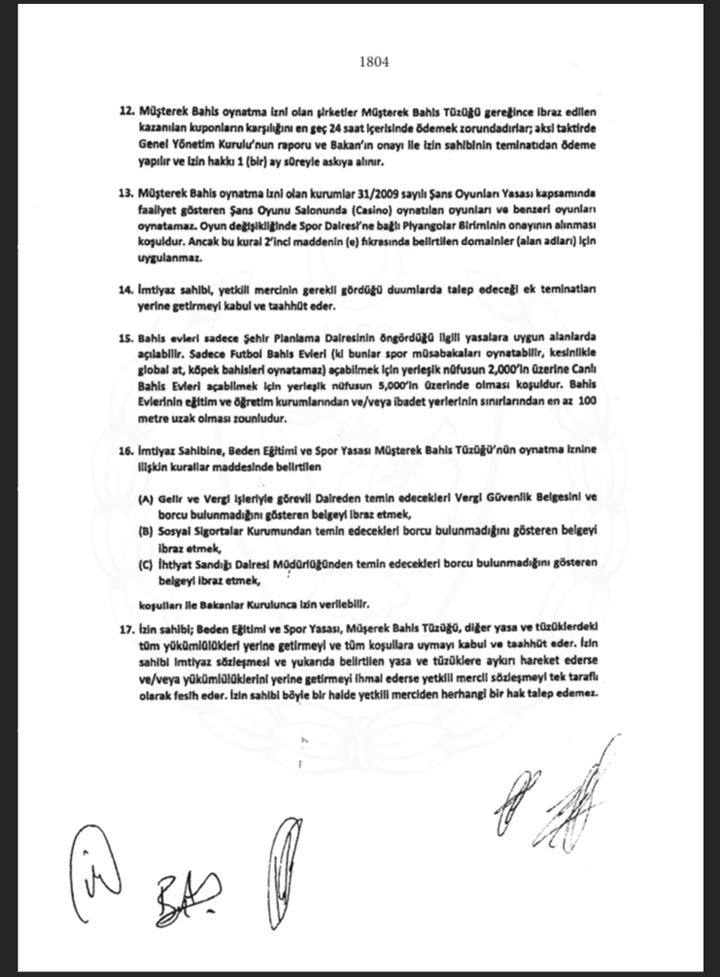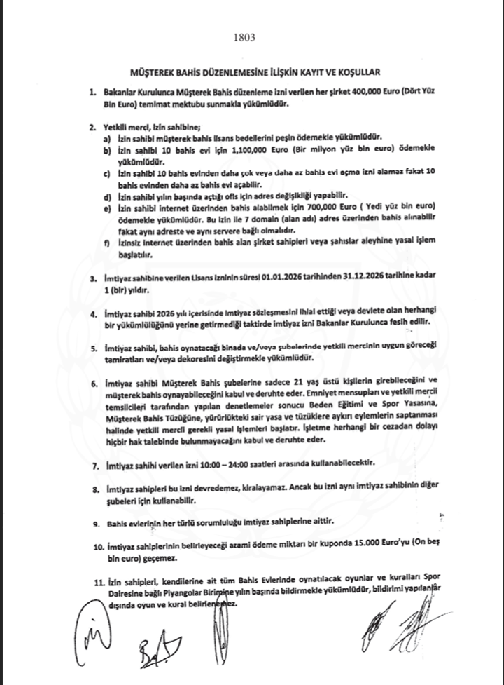 Şans Oyunları Yasası’na aykırı biçimde alınan karar, bahis şirketlerine 700 bin Euro karşılığında internet üzerinden casino oyunu oynatma imkanı tanıyor. Belgedeki 13. madde, casinodaki oyunların yasak olduğunu belirtirken aynı yasağı internet siteleri için istisna tutuyor. Yani bu, bahis evlerinde yasak olan casino oyunlarının online platformlarda serbest olduğu anlamına geliyor.