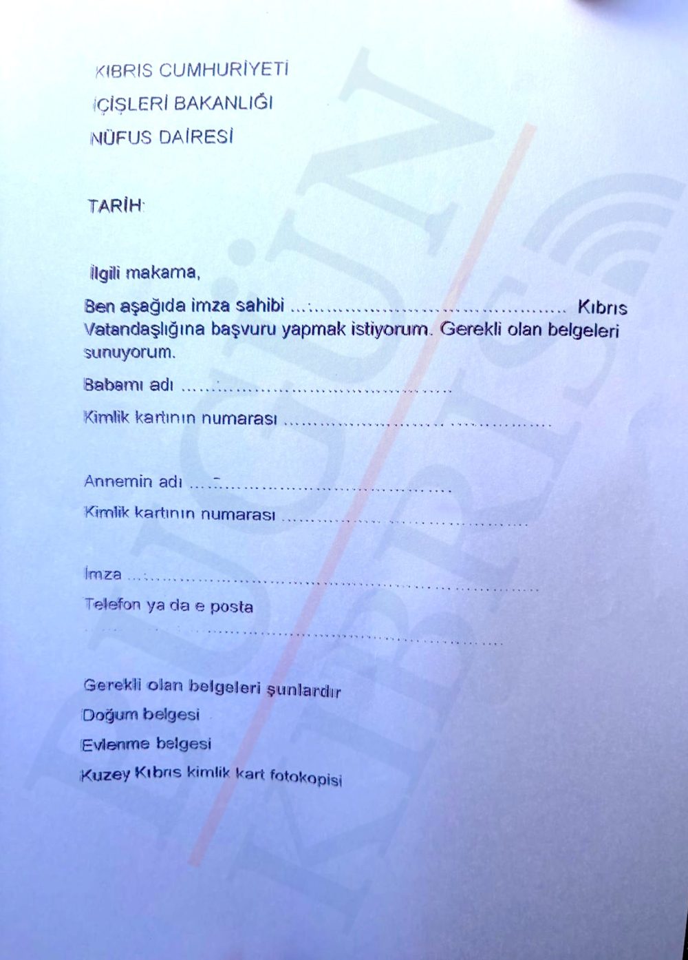 Vatandaşlık başvurusu yapmak isteyenlere verilen dilekçe, Kıbrıs Cumhuriyeti İçişleri Bakanlığı’na bağlı Nüfus Dairesi antetini taşıyor. Formda başvuru sahibinin kimlik ve iletişim bilgileri ile anne ve baba bilgileri yer alıyor. Sunulması istenen belgeler ise doğum belgesi, evlenme belgesi ve Kuzey Kıbrıs kimlik kartı fotokopisi ile sınırlı.