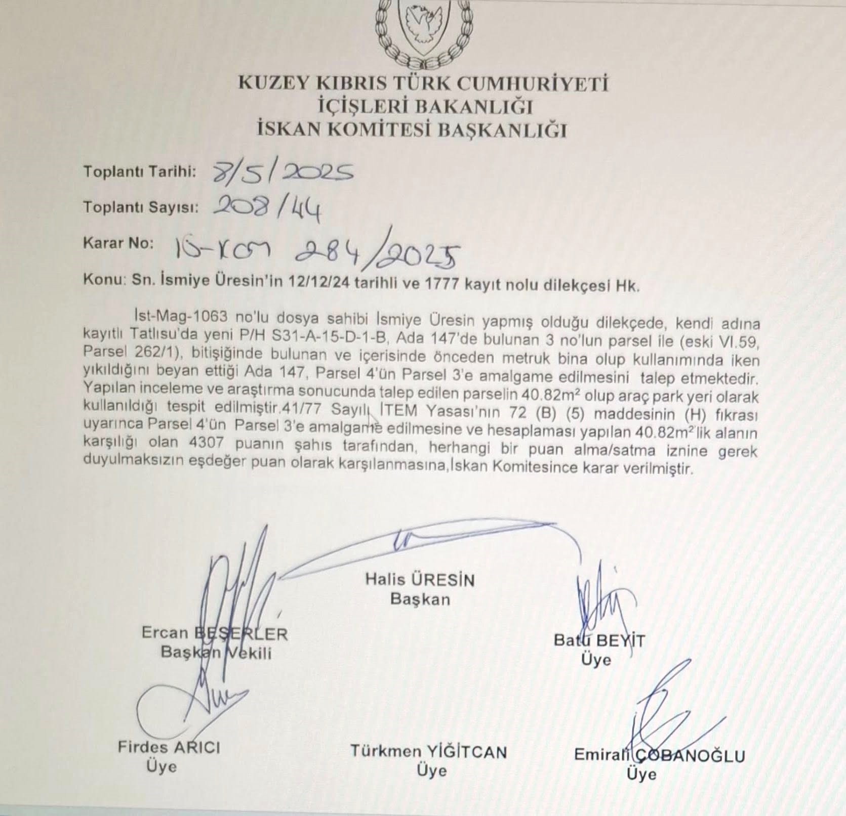 Reynar’ın paylaştığı karara göre, 8 Mayıs 2025 tarihinde toplanan İskan Komitesi Başkanlığı, skandal bir karara imza attı ve bu karara Başkan Üresin ile birlikte diğer komite üyeleri de imza koydu.