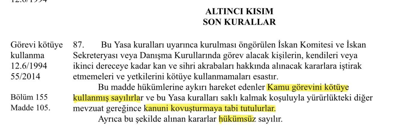 Reynar, paylaşımında İskan Komitesinin Çalışma Usul ve Esaslar Tüzüğü’nün 8. maddesine dikkat çekti. Söz konusu madde şöyle: