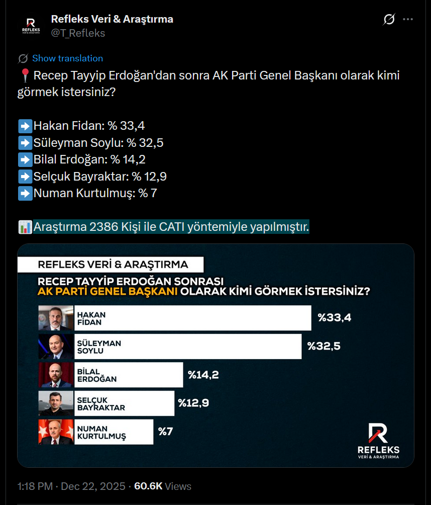 AKP’li Cumhurbaşkanı Recep Tayyip Erdoğan sonrası AKP’nin başına kimin geçeceği gündemin en önemli konularından biri. Refleks Veri & Araştırma’nın bu konuyla ilgili geçtiğimiz hafta yaptığı ankette ilginç sonuçlar var.