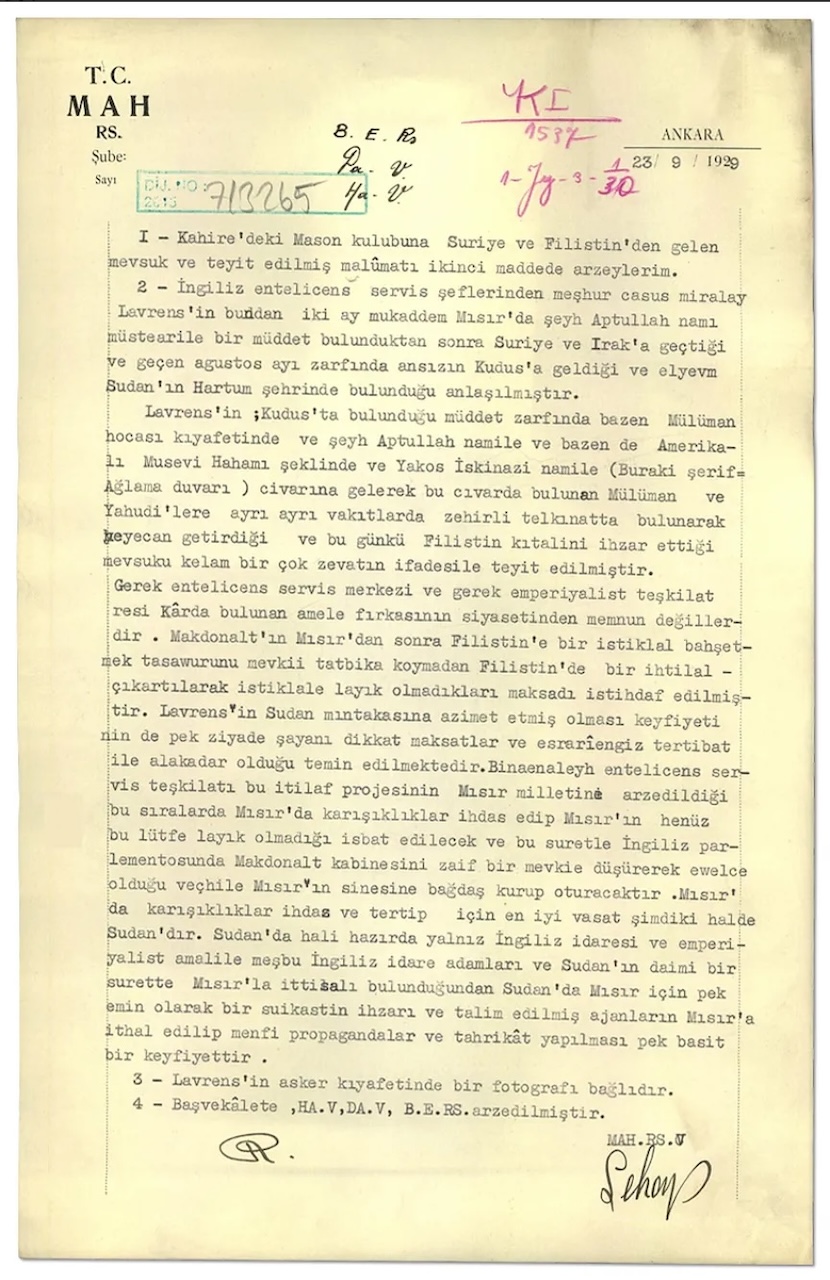 Bu belge, “Arabistanlı Lawrence” olarak bilinen ünlü İngiliz ajanı Thomas Edward Lawrence’ın, Mısır, Suriye ve Irak’ta kıyafet değiştirerek ve farklı isimler altında yürüttüğü faaliyetlere ilişkin olarak Milli Emniyet Hizmeti Riyaseti tarafından hazırlanan 23 Eylül 1929 tarihli yazı oldu.