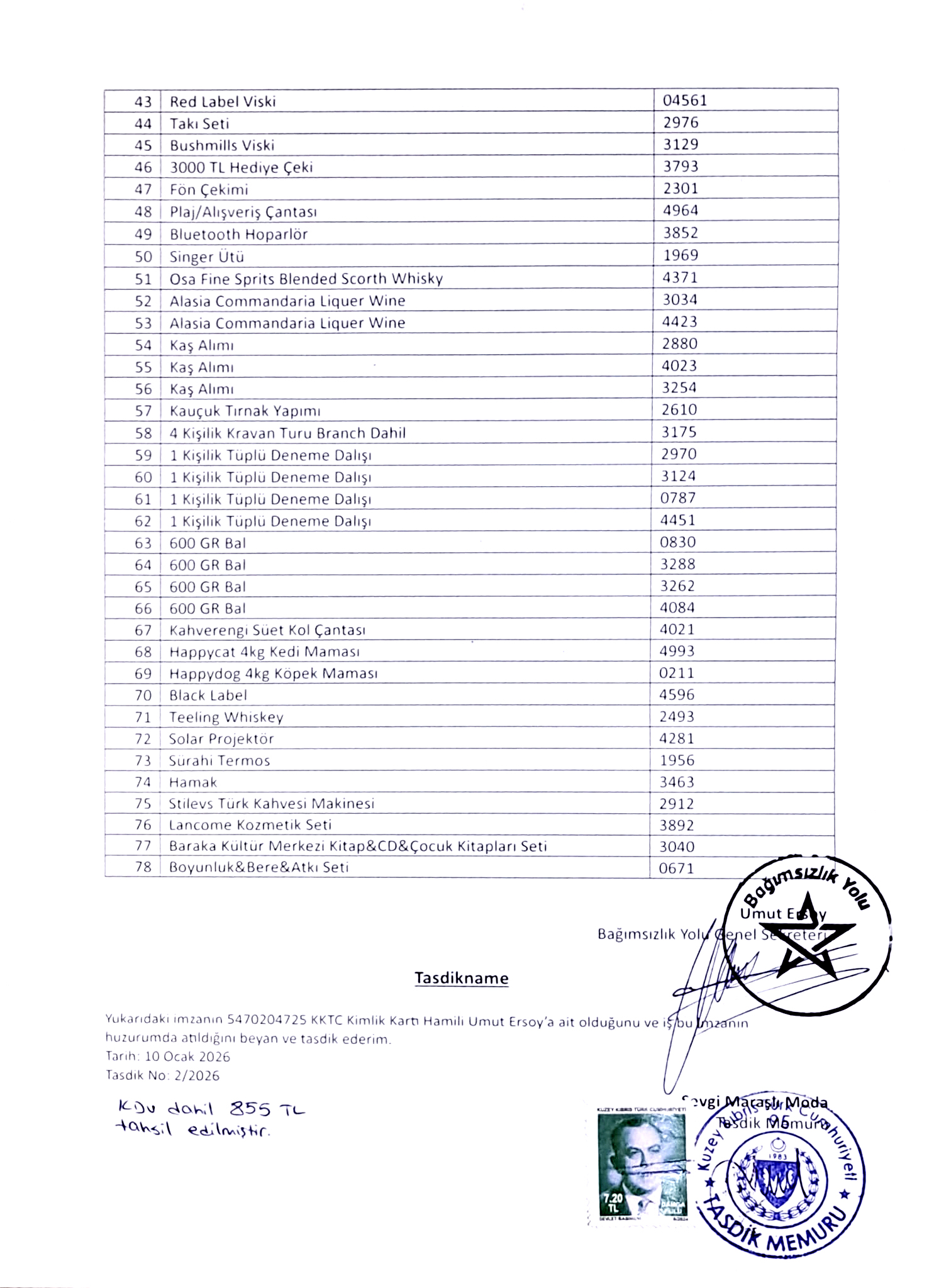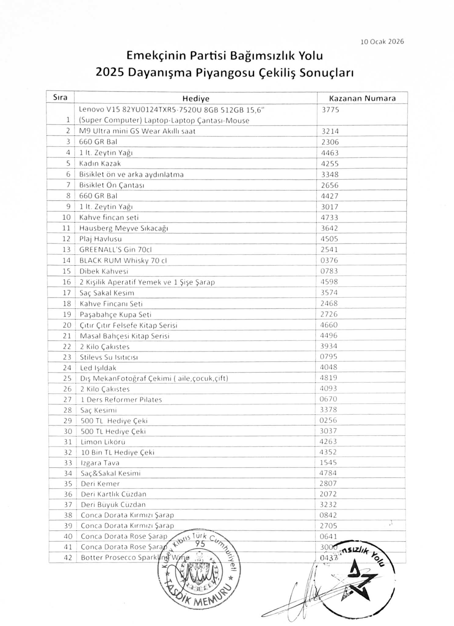 Bağımsızlık Yolu’nun dayanışma amacıyla düzenlediği ve “Emekçinin Piyangosu” olarak da anılan piyango çekilişi, 10 Ocak 2026 tarihinde Bağımsızlık Yolu Parti Merkezi’nde noter huzurunda yapıldı. Çekilişe parti üyeleri ve dostları katıldı.