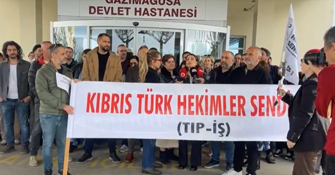 Hekimlerin 6 Şubat’ta başlattıkları grev, bugün Mağusa Devlet Hastanesi önünde yapılan eylemle sürdü. Basın açıklamasını Tıp-İş Başkanı Özlem Gürkut okudu. Açıklama sırasında, grevde olan hekimlerin görev yaptıkları hastaneye alınmadığı, kendilerine “kapının önünde duracaksınız” denildiği ifade edildi. Gürkut, bu duruma rağmen açıklamayı hastane önünde yaptıklarını belirtti.