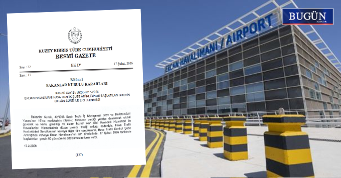 “Bakanlar Kurulu, 42/1996 Sayılı Toplu İş Sözleşmesi Grev ve Referandum Yasası’nın 16’ncı maddesinin (3)’üncü fıkrasının verdiği yetkiye dayanarak, ulusal güvenlik ve kamu güvenliği ve elzem hizmet olan Sivil Havacılık Hizmetleri ile Havaalanları Hizmetlerinde düzen bozucu niteliği olduğu nedeniyle, Hava Trafik Kontrolörleri Sendikası’nın ve/veya diğer tüm sendikaların, Hava Trafik Kontrol Şube Amirliği’nde ve/veya Ercan Havalimanı’nın tüm birimlerinde, 17 Şubat 2026 tarihinde başlattıkları grevin 60 gün süre ile ertelenmesine karar verdi.”