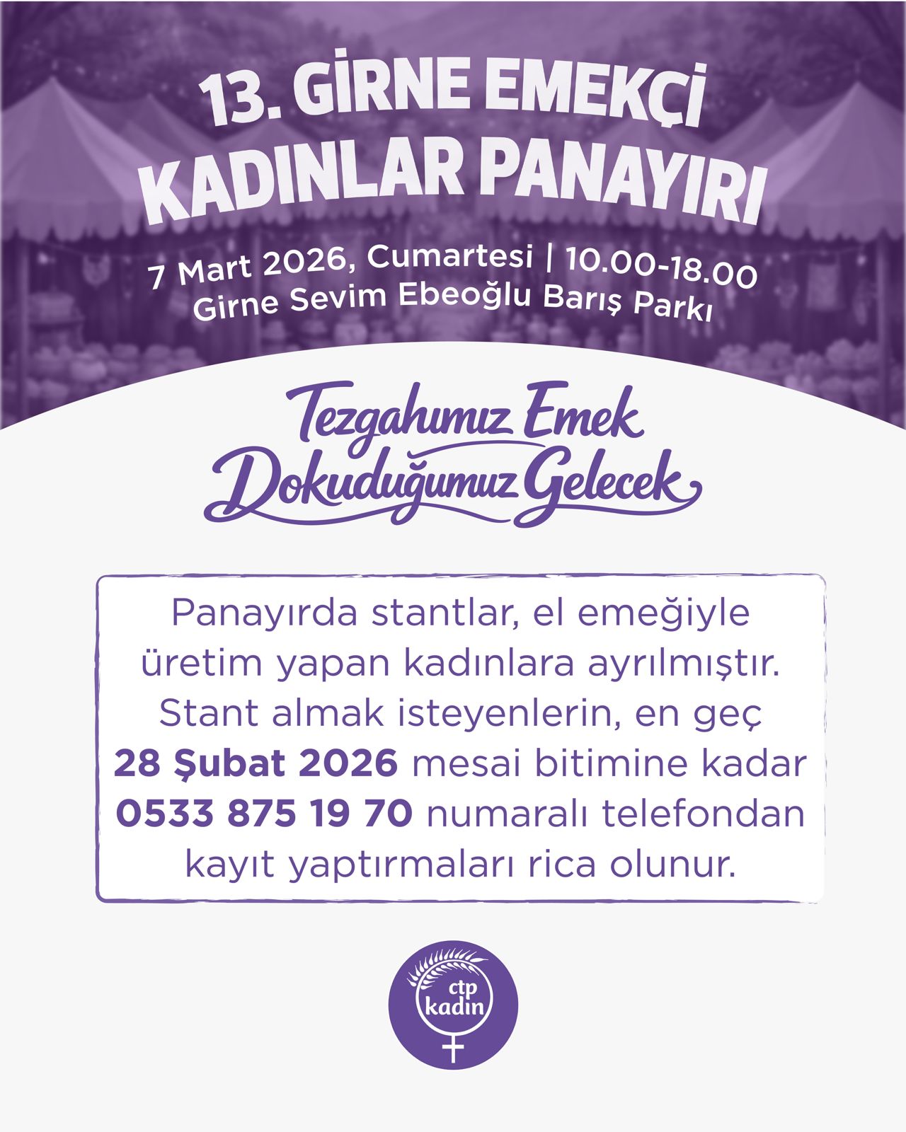 Program detaylarının önümüzdeki günlerde açıklanacağı etkinlikte stant açmak, etkinlik sergilemek ya da mesaj iletmek isteyen kadınlar ile sivil toplum örgütlerinin, en geç 28 Şubat 2026 tarihine kadar 0533 875 1970 numaralı telefondan CTP Kadın Örgütü Girne İlçesi’ne ön kayıt yaptırması gerekiyor.