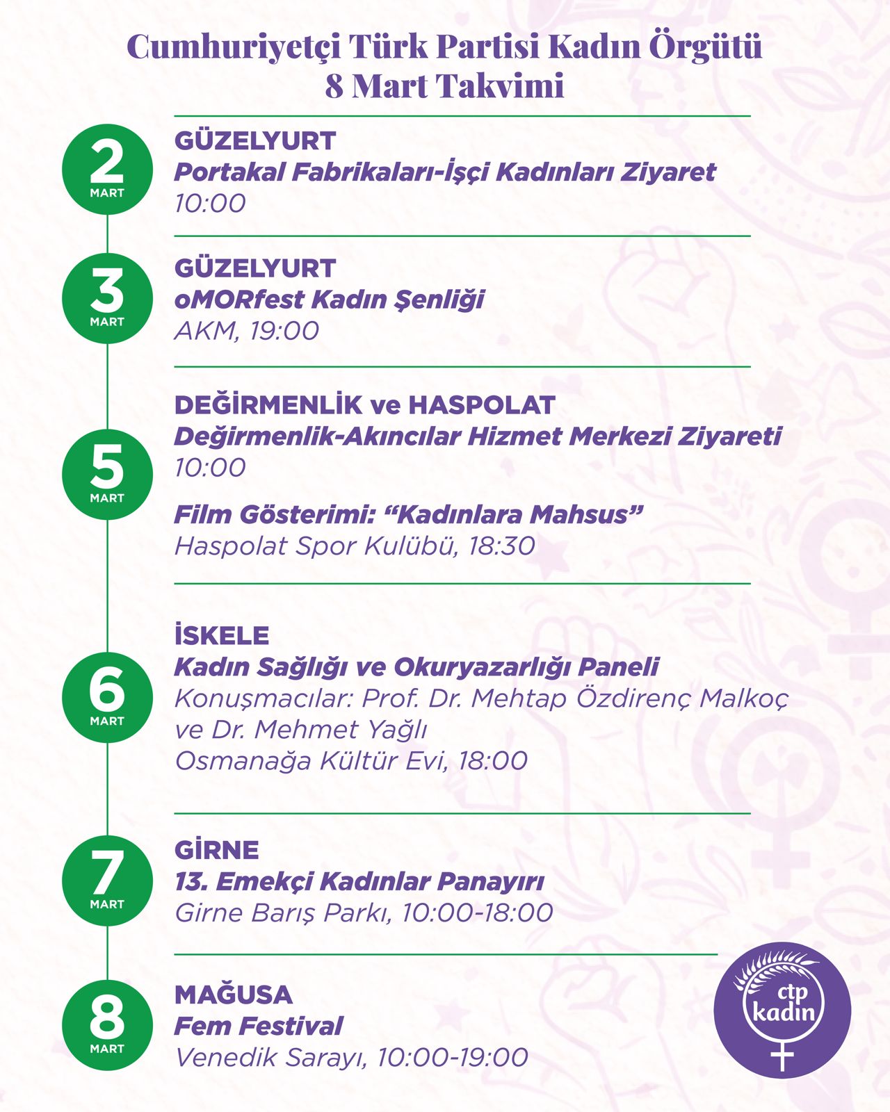 CTP Kadın Örgütü 8 Mart etkinliklerine 2 Mart Pazartesi günü Güzelyurt’ta Portakal Fabrikaları’nda işçi kadınlara gerçekleştireceği ziyaret ile başlayacak. Ardından 3 Mart Salı akşamı Güzelyurt AKM’de oMORfest Kadın Şenliği düzenlenecek. 5 Mart Perşembe günü Değirmenlik-Akıncılar Hizmet Merkezi ziyareti yapılacak ve aynı gün Haspolat Spor Kulübü’nde “Kadınlara Mahsus” filmi gösterilecek. Program, 6 Mart’ta İskele’de gerçekleştirilecek “İmbikten Süzdüklerimiz 3: Kadın Sağlığı ve Okuryazarlığı” paneli ile devam edecek; 7 Mart’ta Girne Barış Parkı’ndaki 13. Emekçi Kadınlar Panayırı ve 8 Mart’ta Mağusa Venedik Sarayı’nda düzenlenecek Fem Festival ile son bulacak.