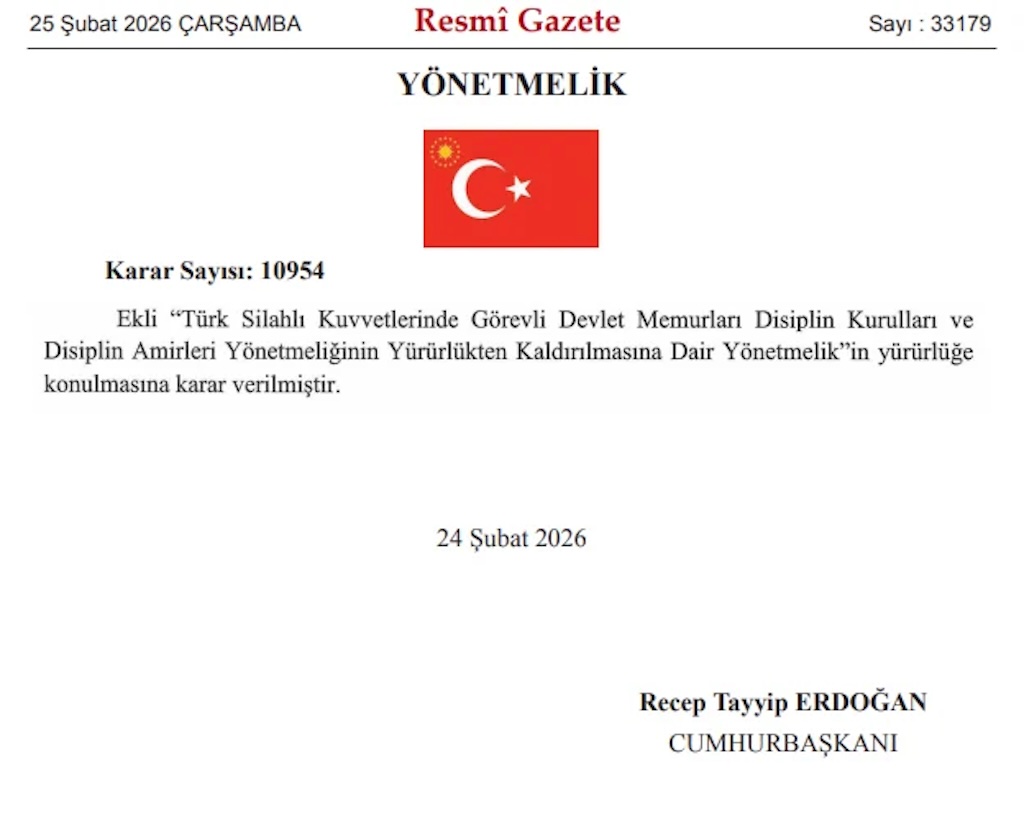 Türk Silahlı Kuvvetleri (TSK)’da sivil devlet memurlarının disiplin işleyişini düzenleyen 43 yıllık yönetmelik Türkiye Cumhurbaşkanı Erdoğan’ın imzasıyla yürürlükten kaldırıldı. 1983’ten beri uygulanan metin, disiplin kurullarının yapısını ve disiplin amirlerinin yetki-sorumluluklarını belirliyordu. Düzenleme kaldırılınca, disiplin işlemlerinin hangi ayrıntılı kurallarla yürütüleceği “üst mevzuat” ve yeni idari düzenlemelere bırakıldı.