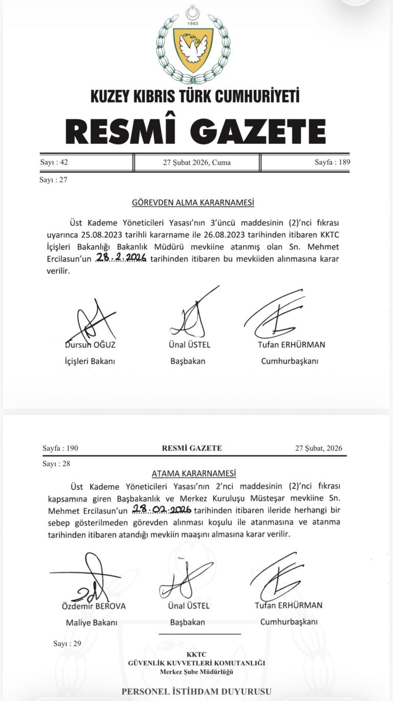 27 Şubat 2026 tarihli Resmi Gazete’de yer alan kararda, Üst Kademe Yöneticileri Yasası’nın 3’üncü maddesinin 2’nci fıkrası uyarınca, 25.08.2023 tarihli kararname ile 26.08.2023 tarihinden itibaren İçişleri Bakanlığı Bakanlık Müdürü olarak görev yapan Mehmet Ercilasun’un 28.02.2026 tarihi itibarıyla bu görevinden alındığı belirtildi.