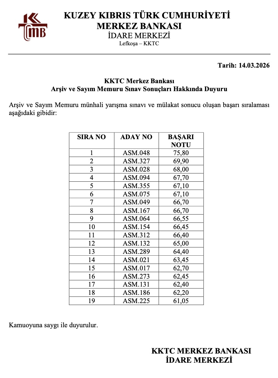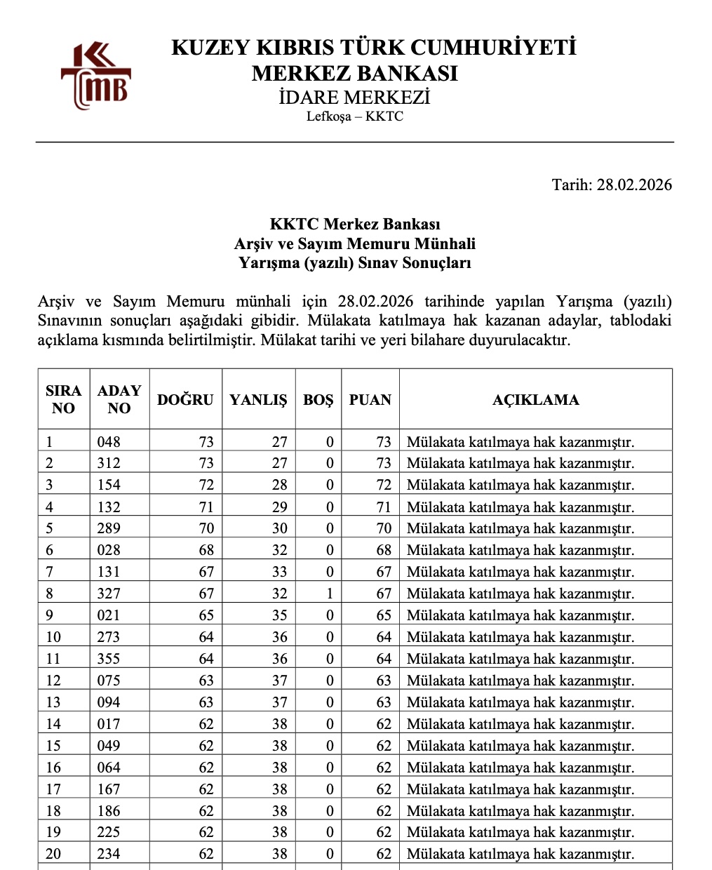 KKTC Merkez Bankası’nın 8 kişilik “Arşiv ve Sayım Memuru” münhalinde, yazılı sınav sonuçları ile mülakat sonrası açıklanan nihai başarı sıralaması arasındaki fark dikkat çekti. Yazılı sınavda ilk 8’de yer alan 5 aday, mülakat sonrası oluşan nihai listede işe giremedi. Buna karşılık, yazılı sıralamada 11 ile 17’nci basamak arasında bulunan bazı adaylar ilk 8’e yükselerek kadroya girdi.