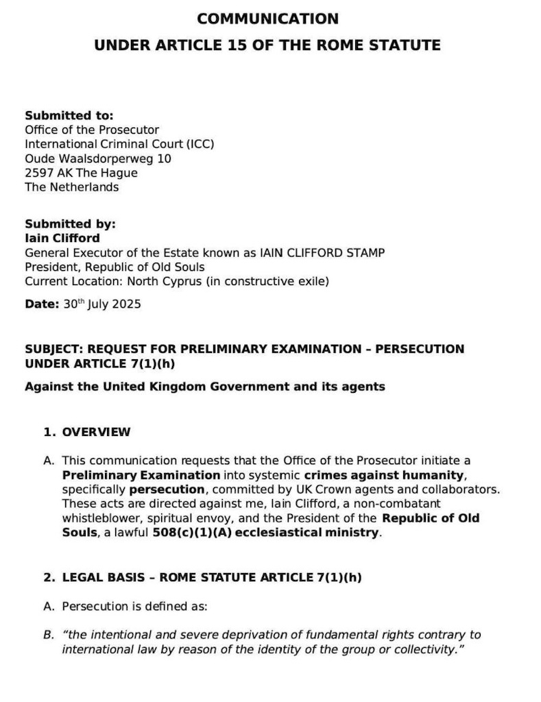 İngiltere’de “sovereign citizen” (egemen vatandaş) söylemiyle tanınan dolandırıcılık zanlısı Iain Clifford Stamp, Lahey’deki Uluslararası Ceza Mahkemesi’ne (UCM) başvurarak kendisine yönelik hukuki süreçleri “insanlığa karşı suç” ile eşdeğer gösteren akıl almaz iddialarda bulundu. Başvurusunda, maruz kaldığını öne sürdüğü muamelenin, “çocuk asker toplama” gibi insanlığa karşı suçlarla aynı düzeyde olduğunu savundu. Ancak İngiliz hukuk çevreleri, bu iddiaları “tamamen uydurma ve mantık dışı” olarak nitelendirdi.