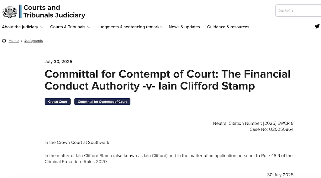 Southwark Yüksek Mahkemesi, 30 Temmuz 2025’te verdiği kararla Clifford’u, mahkeme emirlerini dokuz kez ihlal etmekten 12 ay hapis cezasına çarptırdı. Kararda, Stamp’in duruşmalara katılmayarak Kuzey Kıbrıs’ta bulunduğunu iddia ettiği de belirtildi. Yargıç, Clifford’un davranışlarını “hukuka açıkça meydan okuma” olarak değerlendirerek, en kısa süreli hapis cezasının şart olduğunu vurguladı. Stamp hakkında yakalama kararı çıkarıldı.